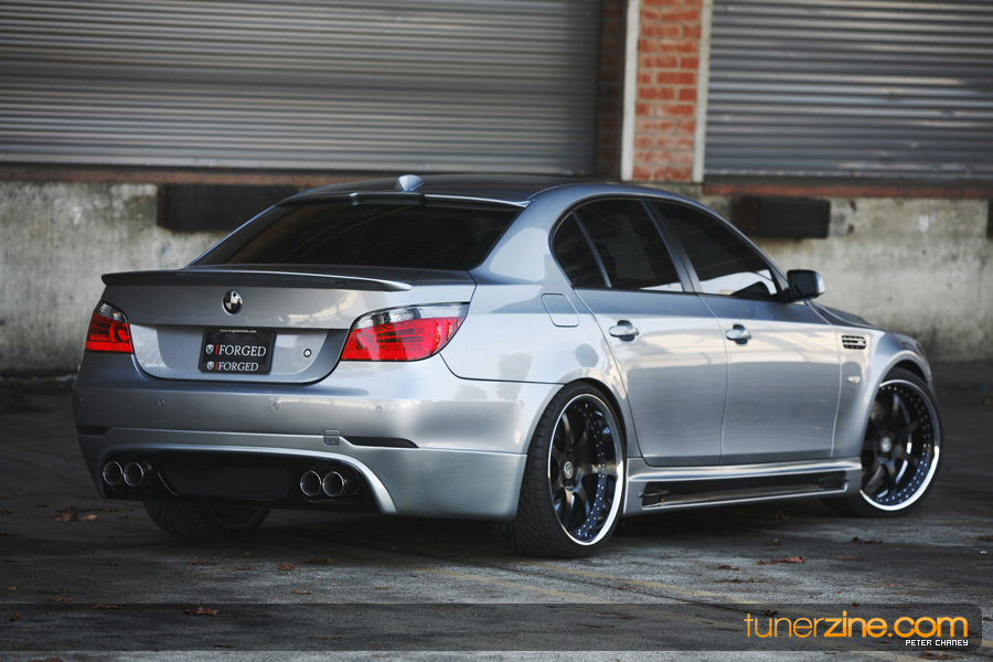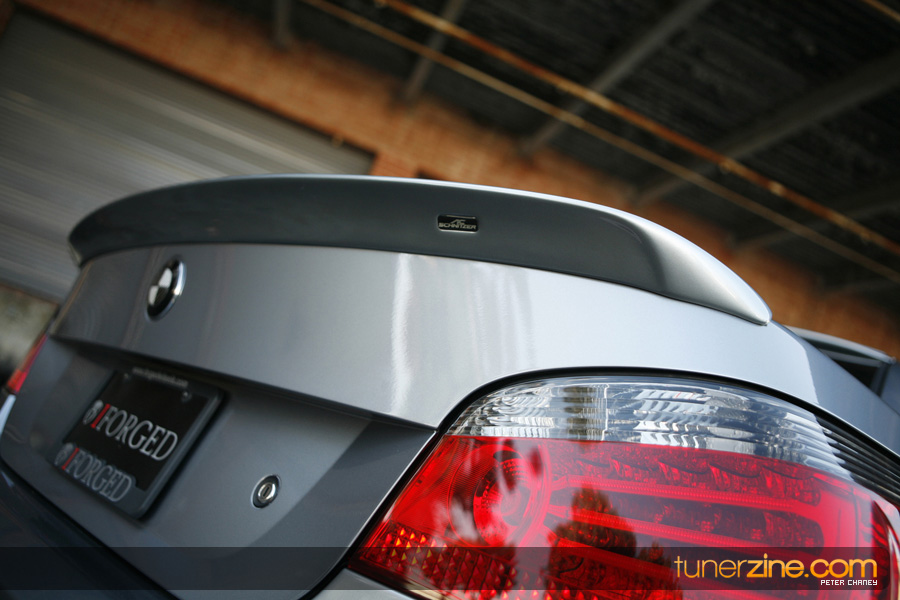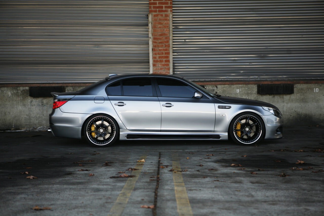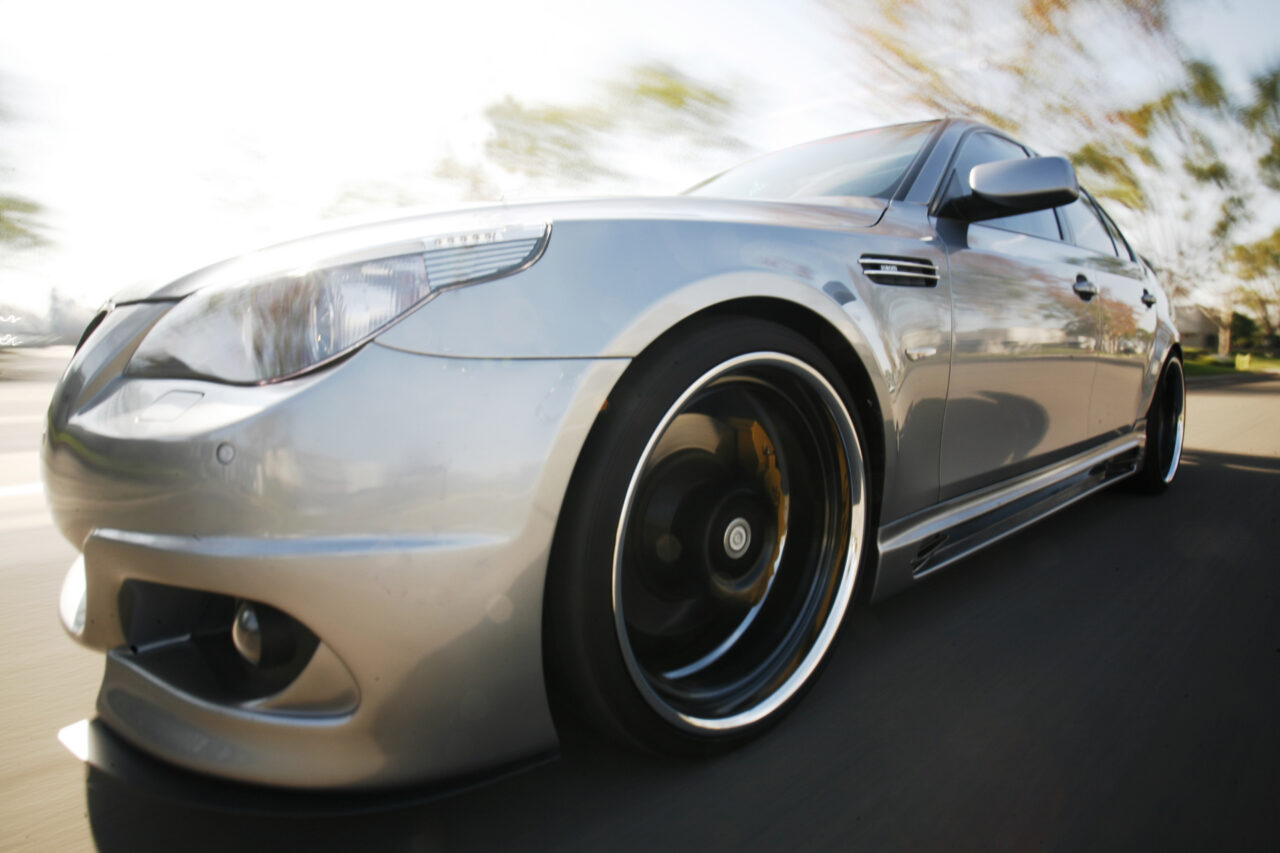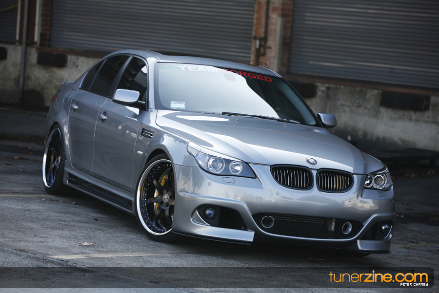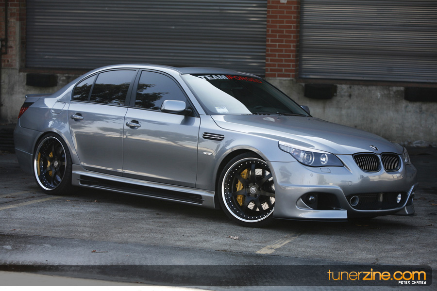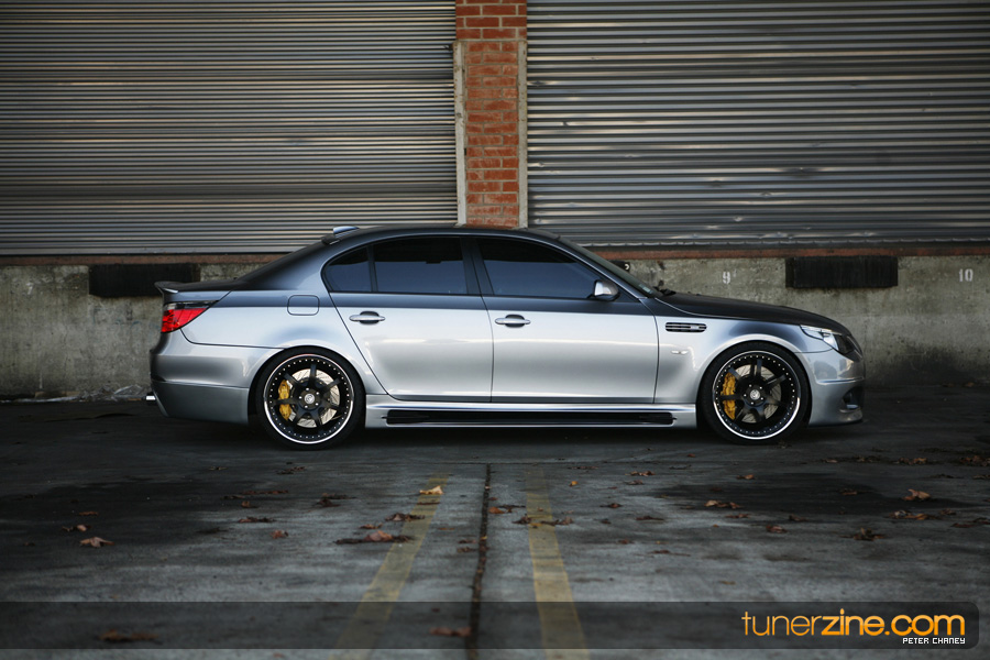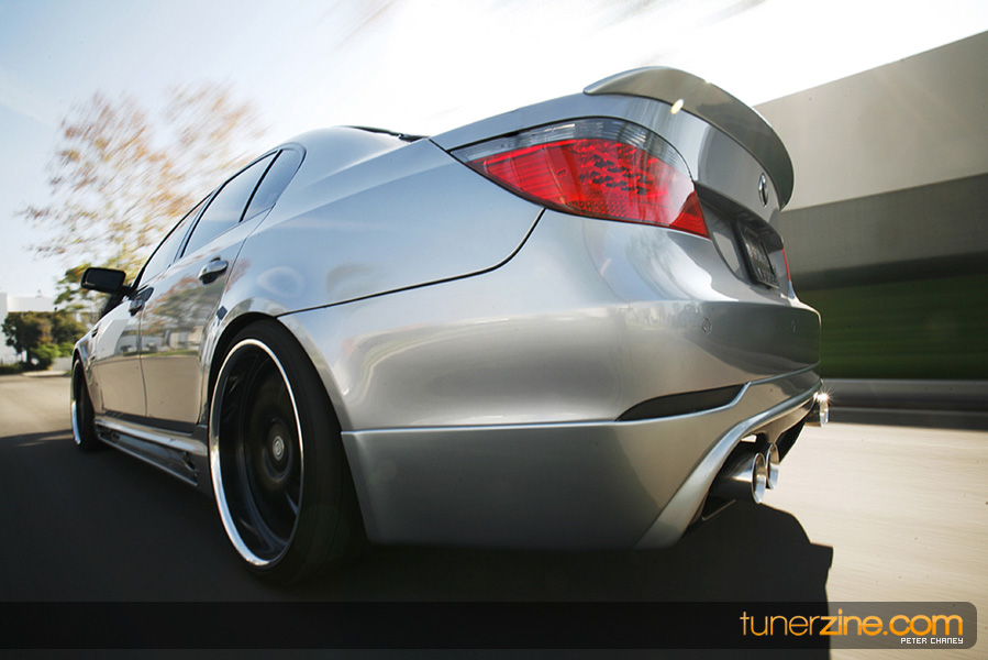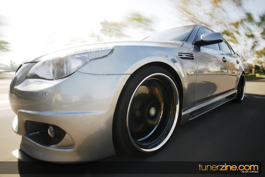 With the overwhelming craze surrounding the BMW’s E92 335i and its new 1-series offering, some of BMW’s bigger brethren has been ignored in the media light. Truth be told however there are plenty of 5-series and even 6-series out there that deserve their fair share of coverage. Enter Ace’s 5-series that we were fortunate enough to spot while stopping by iForged’s facilities. The first thing that naturally caught our eyes was the wheels on the 5er. Ace and iForged not only stepped it up with an aggressive fitment, but our eyes did not deceive us – those were 21s on each corner. iForged stepped it up with their Sprint model for this M5 by outfitting it with 21×9 in the front and 21×10.5 in the rear with a semi-gloss black finish. Toyo’s T1R protects these massive wheels with their 255/30/21 and 295/25/21 sized rubber.