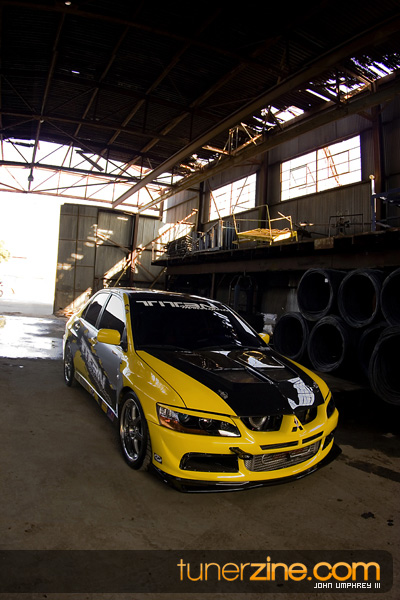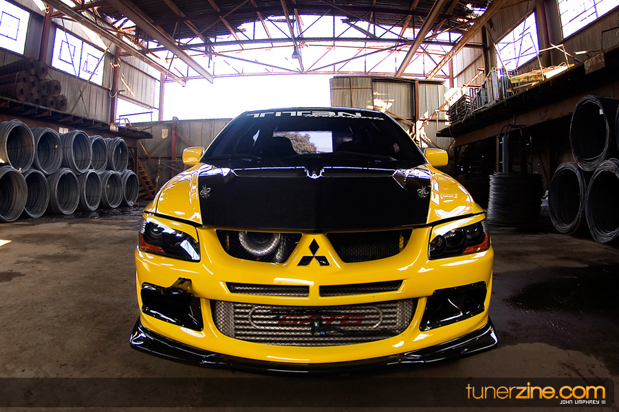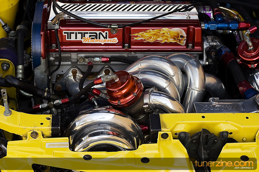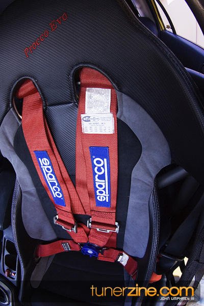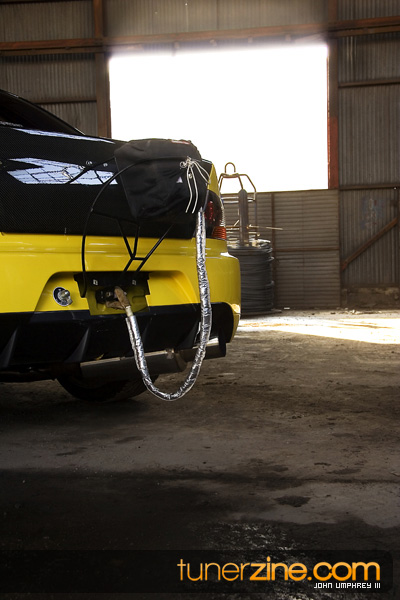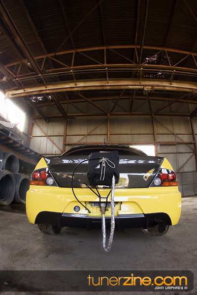 On the exterior, this bright yellow Evolution has been accented with some carbon fiber goods from Varis. Extremely popular in Japan for its styling accessories, Varis has become a household name on the stateside in just a matter of years. Their lightweight carbon fiber hood and front lip can be seen on this VIII. In the rear is an Evo Dave’s carbon fiber trunk and Evo IX rear bumper. JDM MR taillights are the finishing touch something many people are used to seeing on this Evo. In fact, if the parachute wasn’t enough to give you a hint on what’s going on underneath the hood, we don’t know what could be.