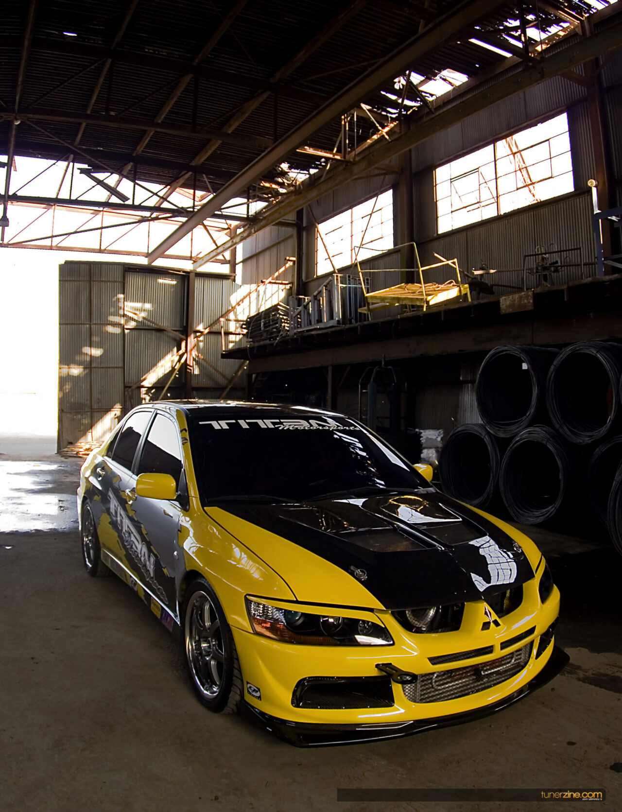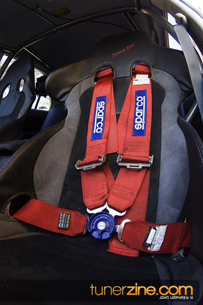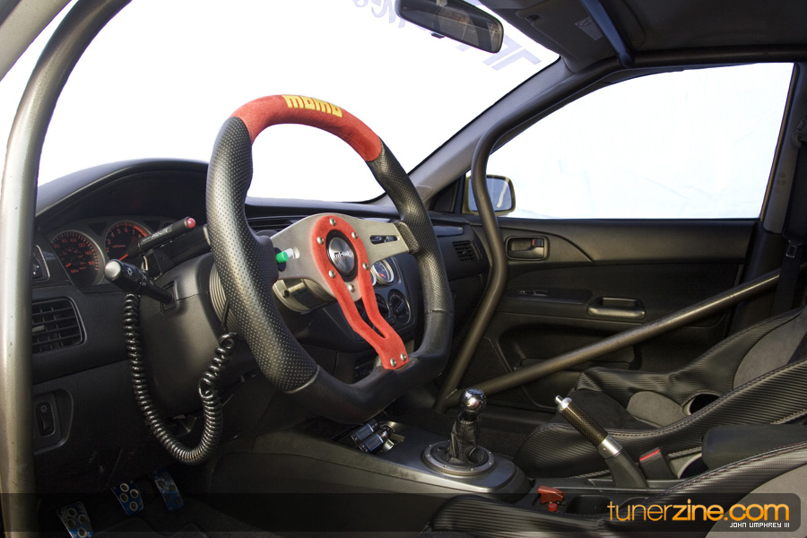 In the inside the car has been kept fairly simple with a full cage, Autometer gauges, MOMO steering wheel and a Profec B spec II boost controller from GReddy. The seats have received a light treatment of customization to remind everyone who respectfully owns this bad ass Evo. Suspension wise, the Evo receives its ride height adjustment from a set of A’PEXi NR-1 Competition coilovers. A Forge Rally strut bar tightens up the chassis along with the cage.