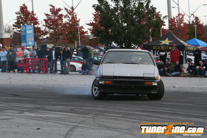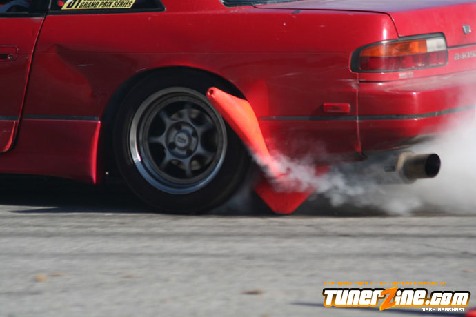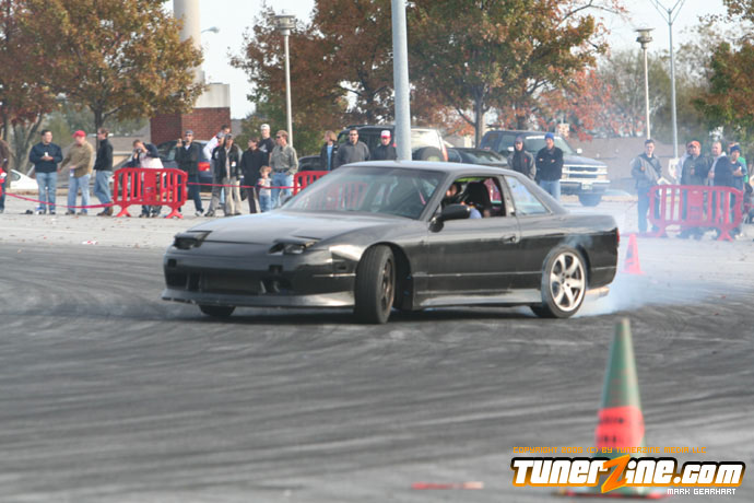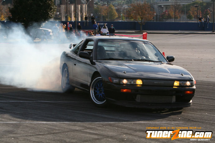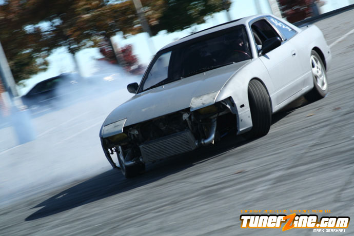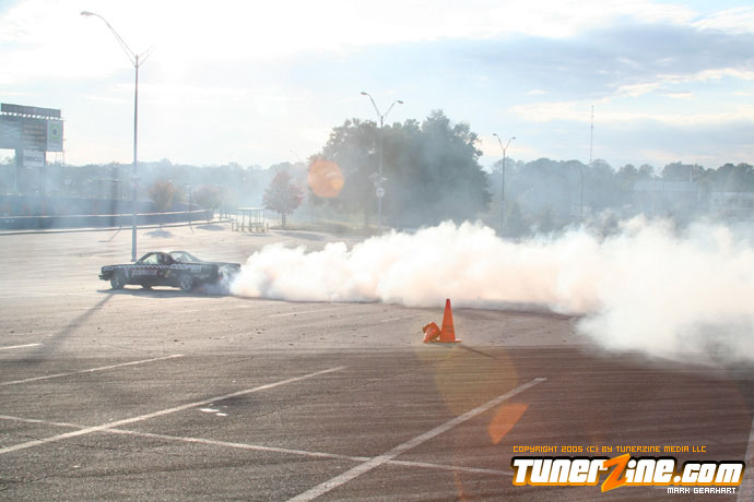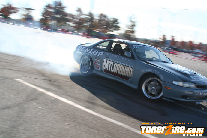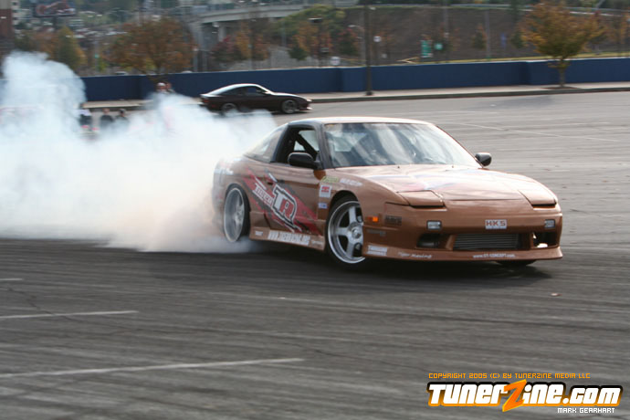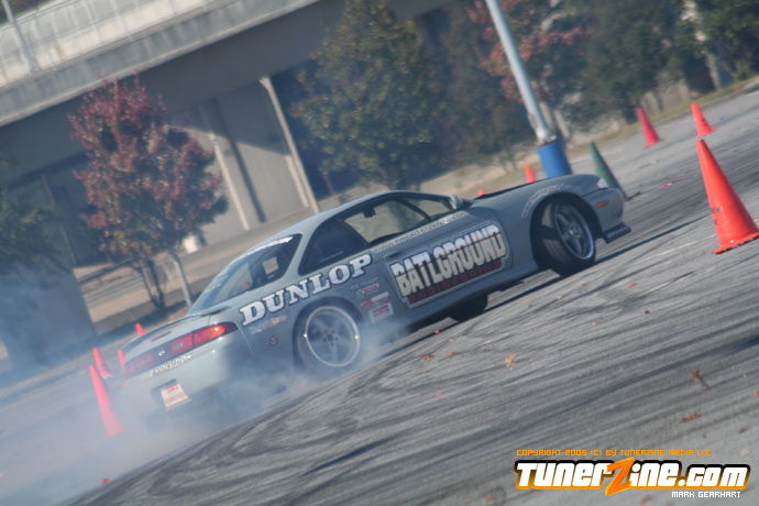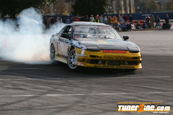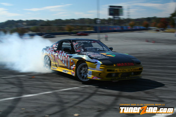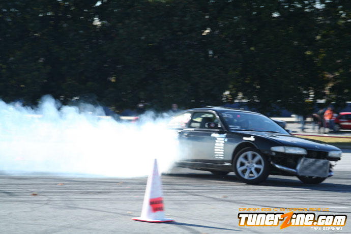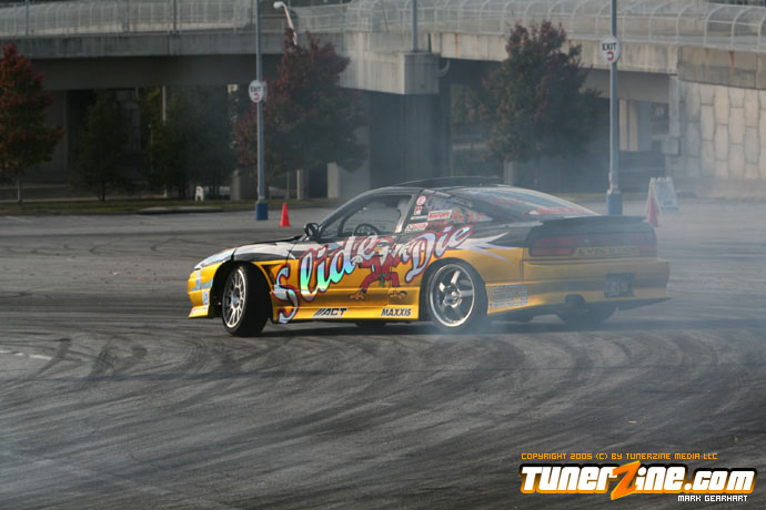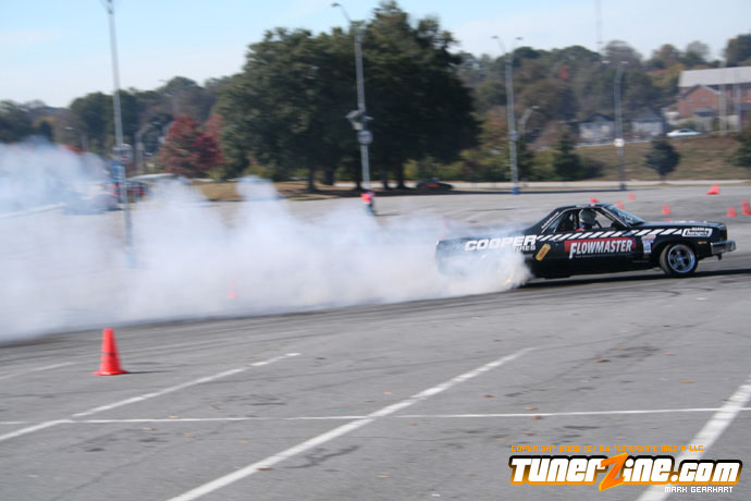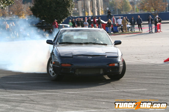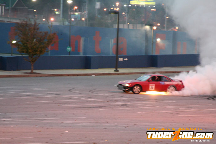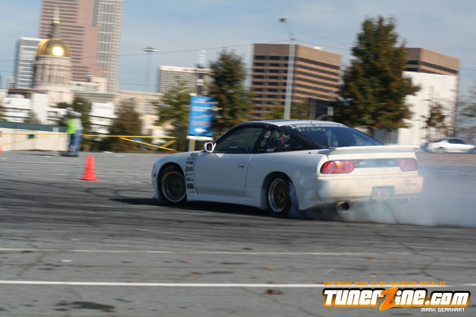 More tire smoke and plenty more rubber is burnt as the grassroots drifting action continues at the Atlanta Drift Expo.