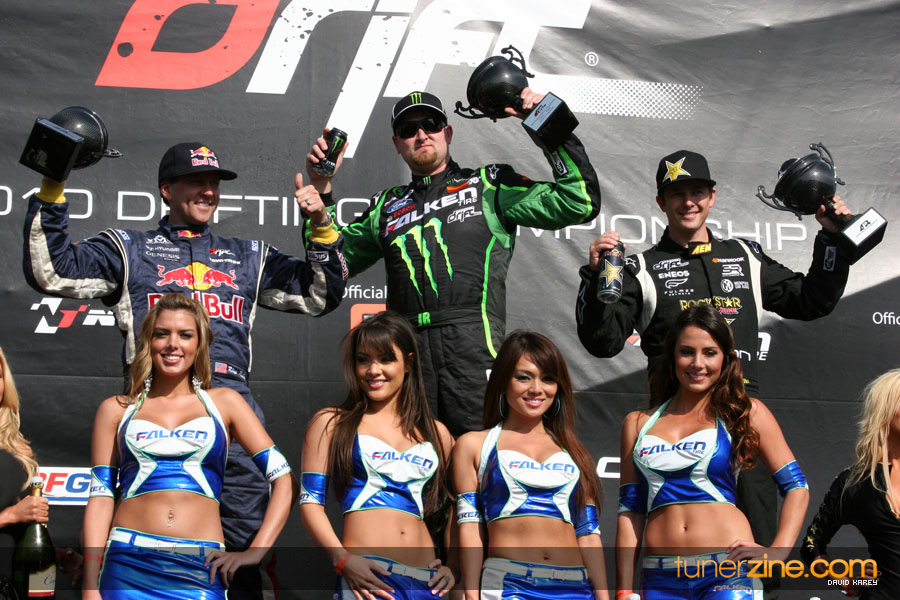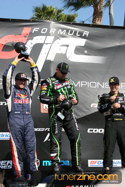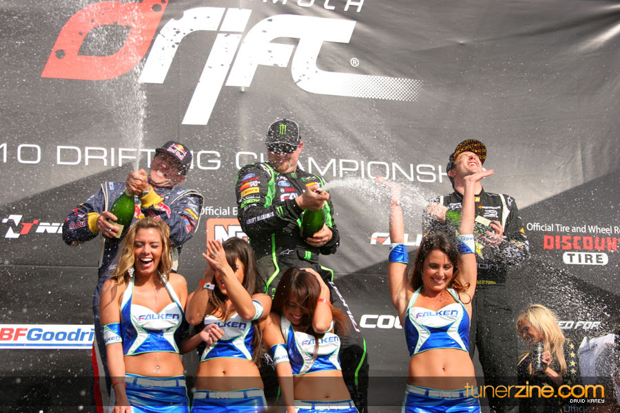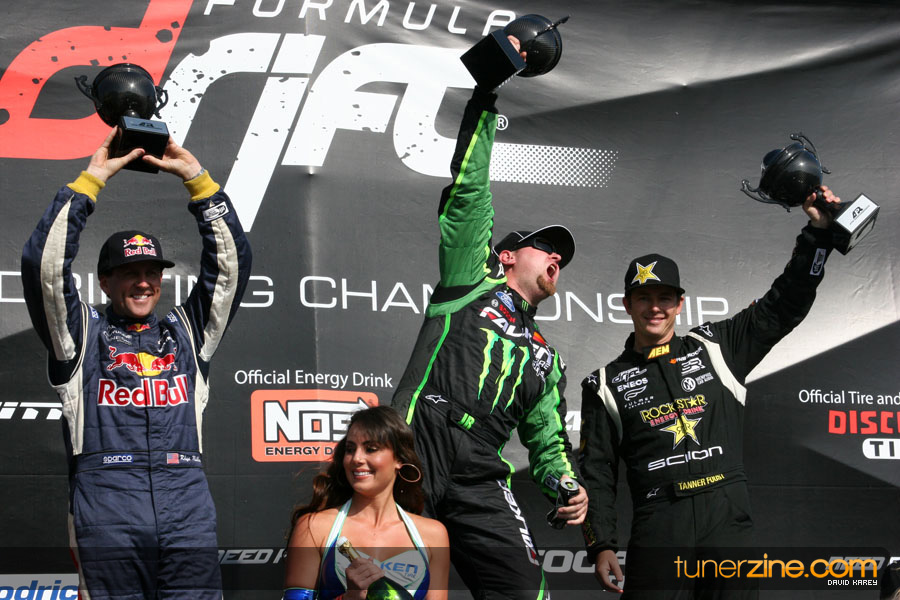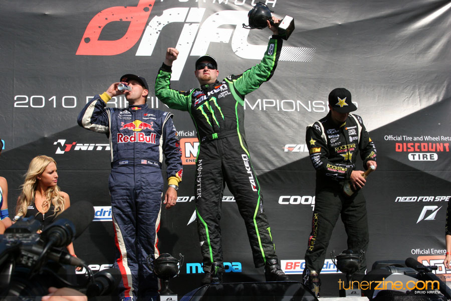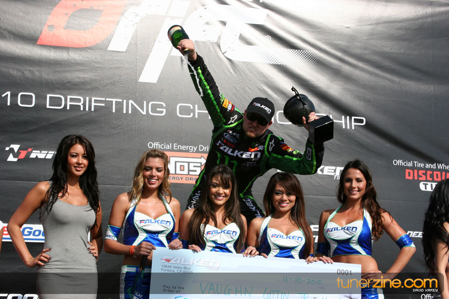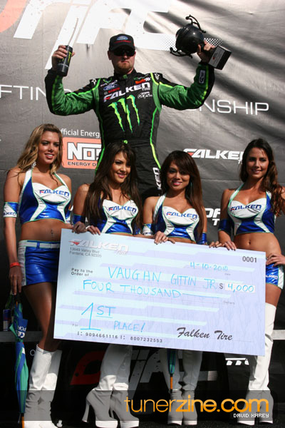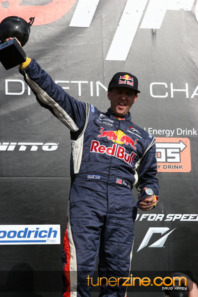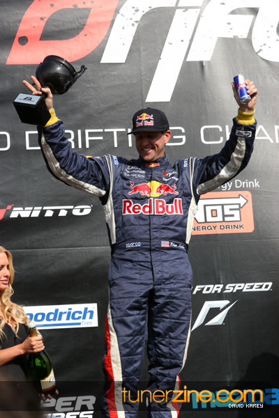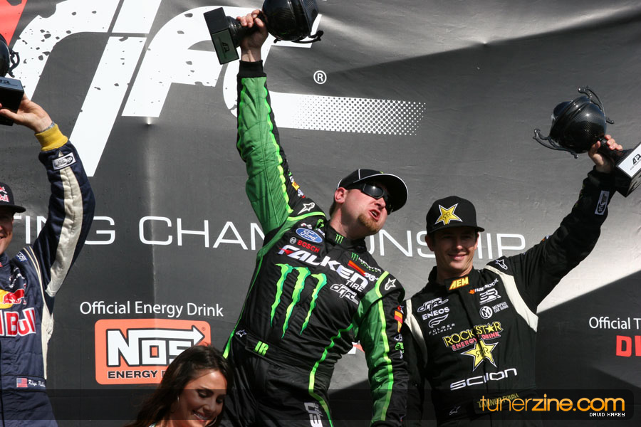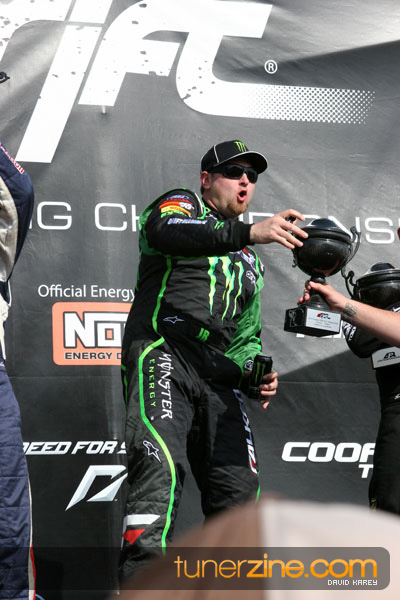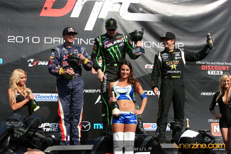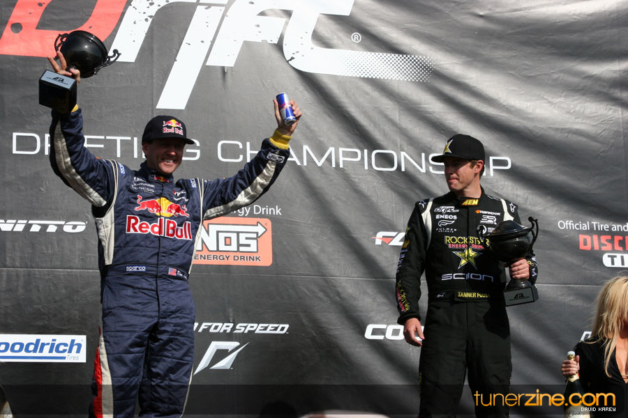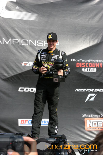 1. Gittin, Vaughn Monster Energy / Falken Tire Ford Mustang 108 Points 2. Millen, Rhys RMR / Red Bull Hyundai Genesis Coupe 100 Points 3. Foust, Tanner Rockstar Energy Scion TC 82 Points 4. Aasbo, Fredric Japan Auto / FSR Toyota Supra 72 Points 5. Tuerck, Ryan Mobil 1 / Maxxis Tire / Gardella Racing Pontiac Solstice 65 Points 6. Hubinette, Samuel SHR-Dodge / BF Goodrich Dodge Challenger 64 Points 7. Mordaunt, Patrick Brian Crower / PM Racing Nissan 350Z 62 Points 8. Deane, James Falken Tire Nissan S15 61.50 Points 9. McNamara, Darren Falken Tire Saturn Sky 60 Points 10. Forsberg, Chris NOS Energy Drink / CFR Nissan 350Z 56 Points 11. Miki, Ryuji APEXi / Hankook Tire Mazda RX-7 56 Points 12. Yoshihara, Daijiro America’s Tire / Falken Tire Nissan S13 56 Points 13. Brakohiapa, Tony Cooper Tire / Sam’s Autoboy Ford Mustang 54.50 Points 14. Verdier, Stephan Royal Purple / Crawford Performace / Cooper / Subaru STI 54.50 Points 15. Wang, Forrest BF Goodrich / K&N Infiniti G35 54.50 Points 16. Takatori, Michihiro BF Goodrich / Exedy Nissan S15 54.25 Points