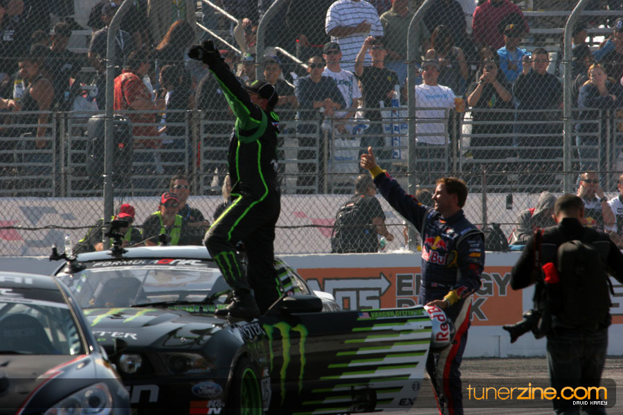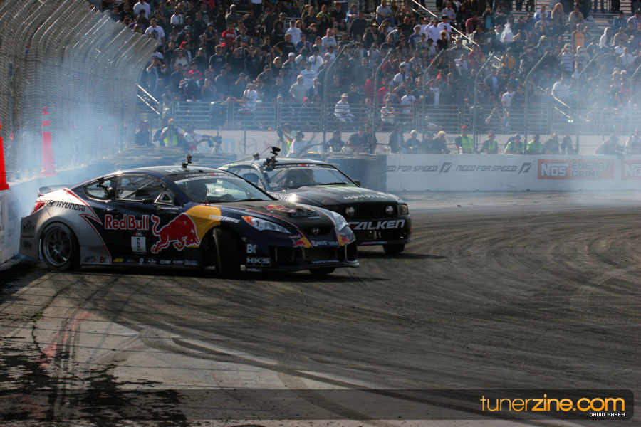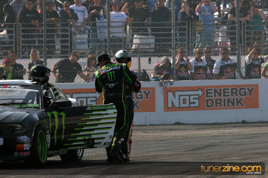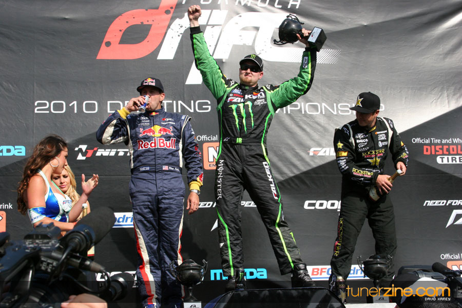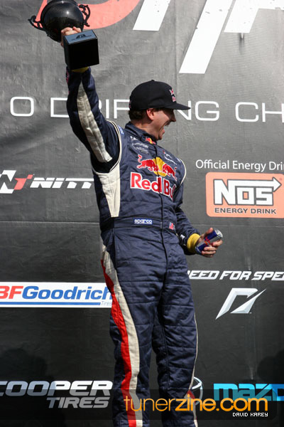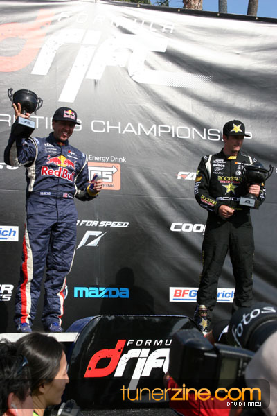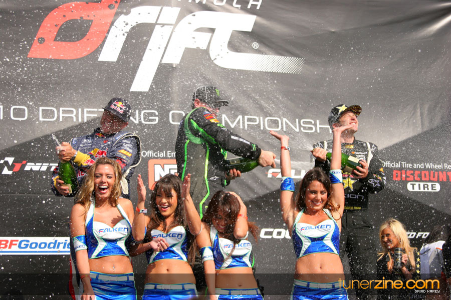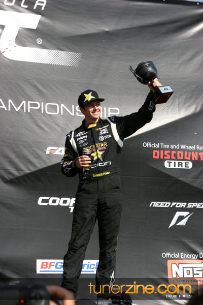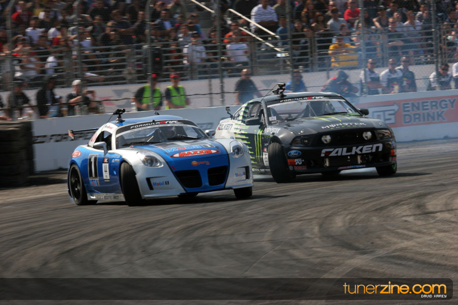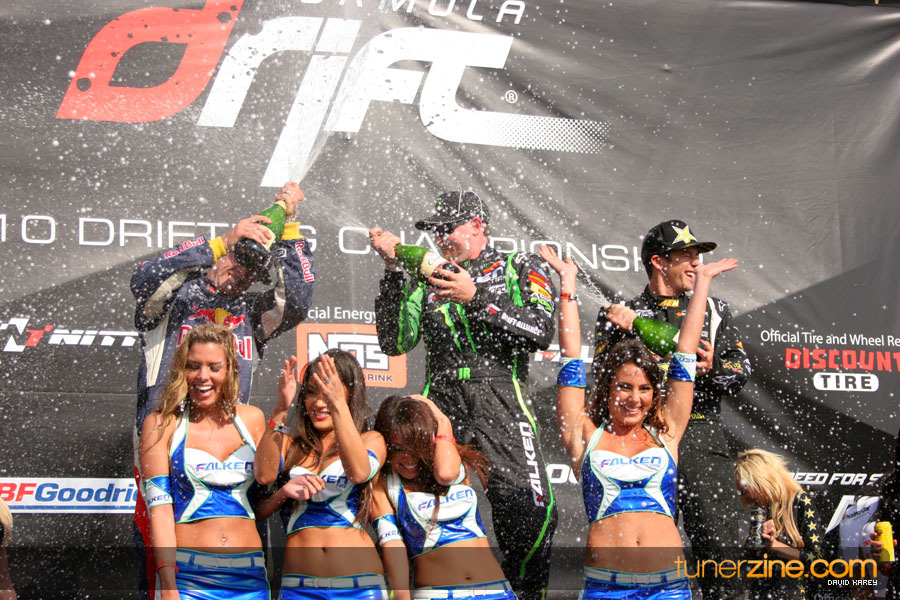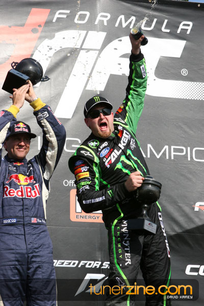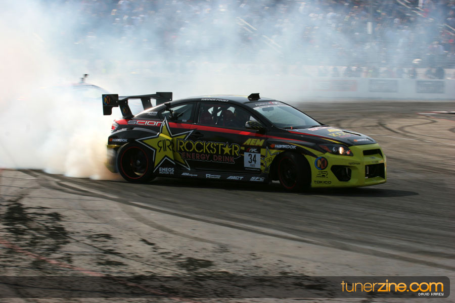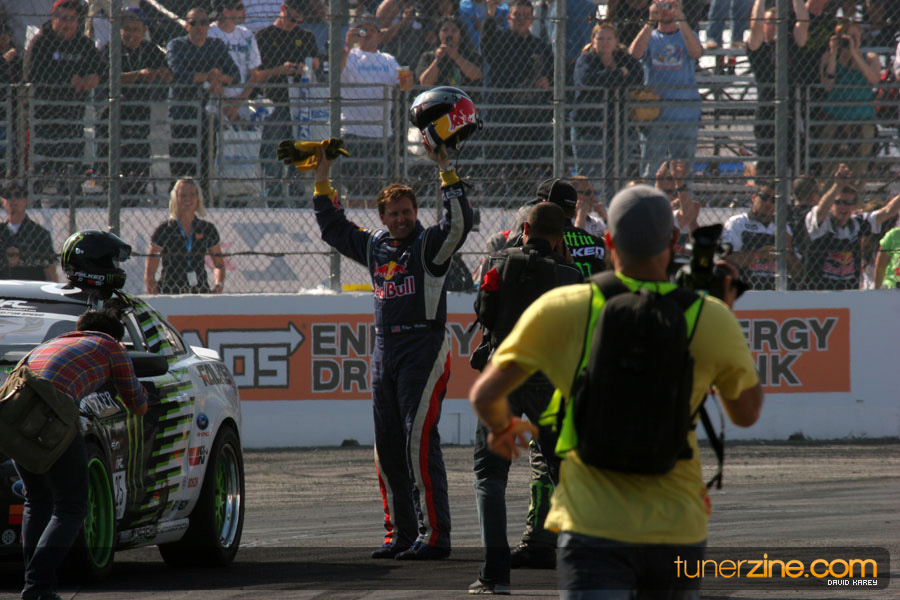 1. Gittin, Vaughn Monster Energy / Falken Tire Ford Mustang 108 Points 2. Millen, Rhys RMR / Red Bull Hyundai Genesis Coupe 100 Points 3. Foust, Tanner Rockstar Energy Scion TC 82 Points 4. Aasbo, Fredric Japan Auto / FSR Toyota Supra 72 Points 5. Tuerck, Ryan Mobil 1 / Maxxis Tire / Gardella Racing Pontiac Solstice 65 Points 6. Hubinette, Samuel SHR-Dodge / BF Goodrich Dodge Challenger 64 Points 7. Mordaunt, Patrick Brian Crower / PM Racing Nissan 350Z 62 Points 8. Deane, James Falken Tire Nissan S15 61.50 Points 9. McNamara, Darren Falken Tire Saturn Sky 60 Points 10. Forsberg, Chris NOS Energy Drink / CFR Nissan 350Z 56 Points 11. Miki, Ryuji APEXi / Hankook Tire Mazda RX-7 56 Points 12. Yoshihara, Daijiro America’s Tire / Falken Tire Nissan S13 56 Points 13. Brakohiapa, Tony Cooper Tire / Sam’s Autoboy Ford Mustang 54.50 Points 14. Verdier, Stephan Royal Purple / Crawford Performace / Cooper / Subaru STI 54.50 Points 15. Wang, Forrest BF Goodrich / K&N Infiniti G35 54.50 Points 16. Takatori, Michihiro BF Goodrich / Exedy Nissan S15 54.25 Points