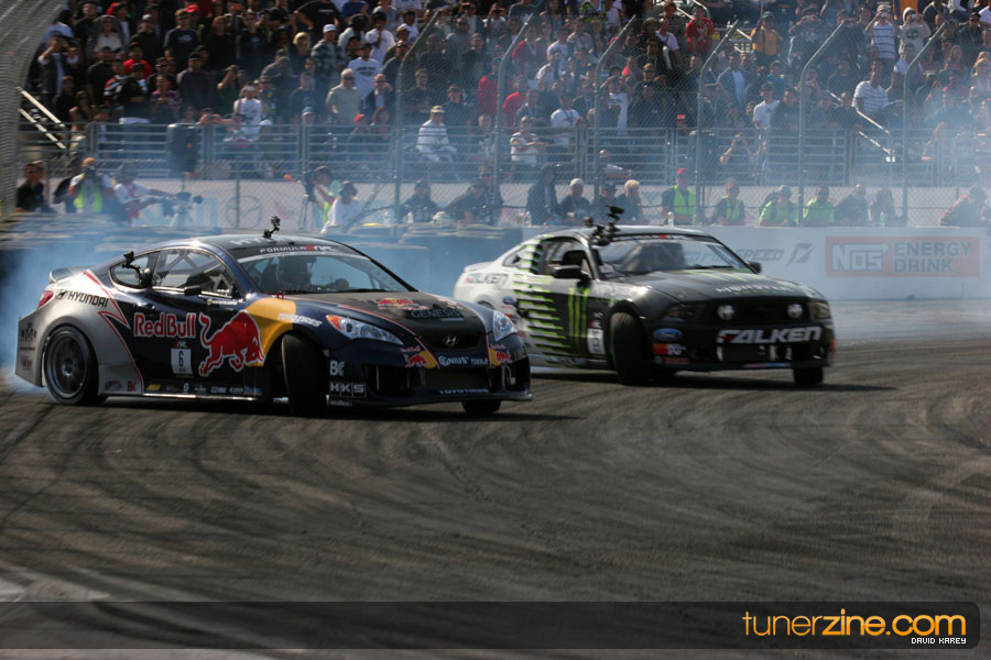 Round 1: Streets of Long Beach started the 2010 season off in exciting fashion with the debut of new drivers, sponsors, and vehicles to the series joining all of the returning teams. 2-time Formula DRIFT champion Tanner Foust piloting the Rockstar Energy Scion TC met rookie Fredric Aasbo in the Japan Auto / FSR Toyota Supra in the consolation round for third place. Foust outmatched the rookie and secured his third place finish. The finals came down to veteran drifters Rhys Millen in the RMR Red Bull Hyundai Genesis Coupe and Vaughn Gittin in the Monster Energy / Falken 2011 Ford Mustang. Gittin secured the victory with aggressive driving of his brand new vehicle to earn the victory and the early lead in the Pro Championship Standings.