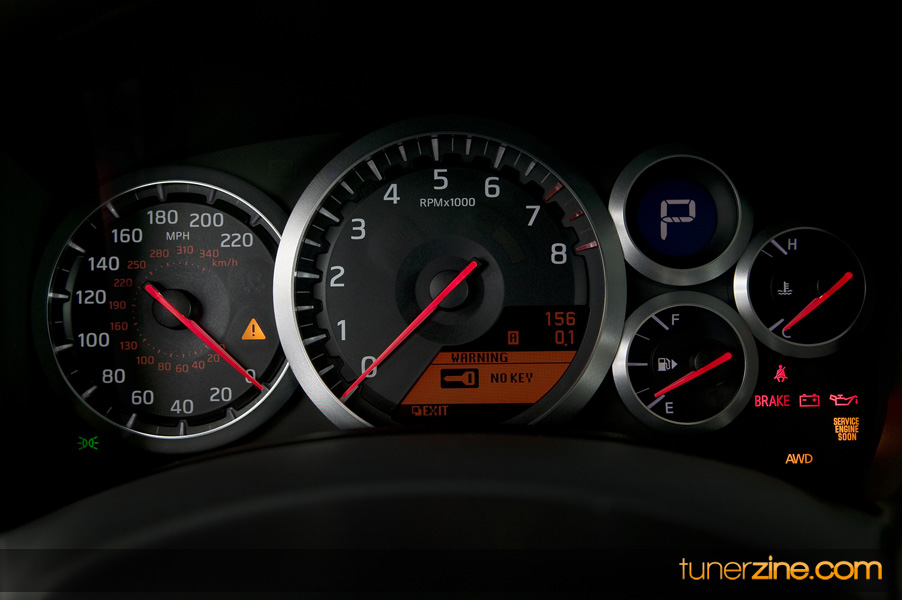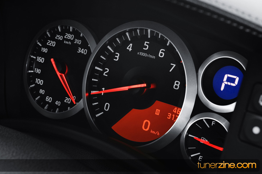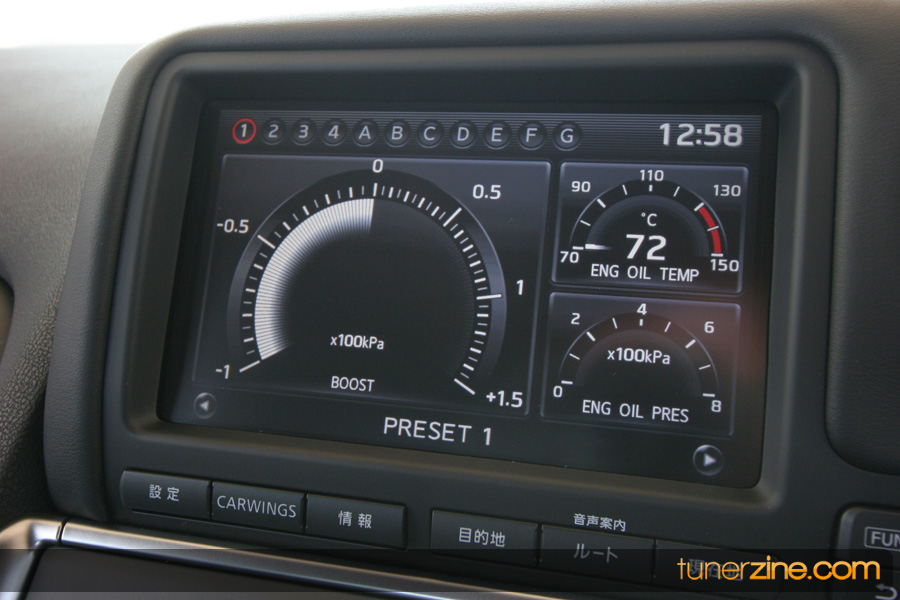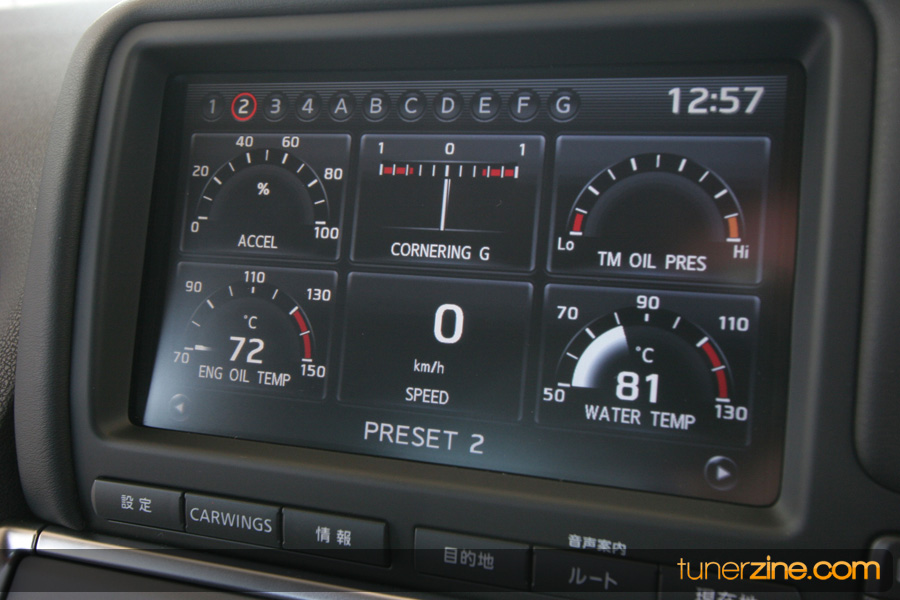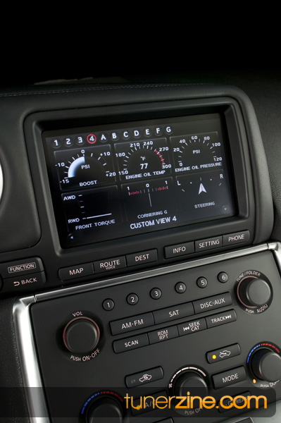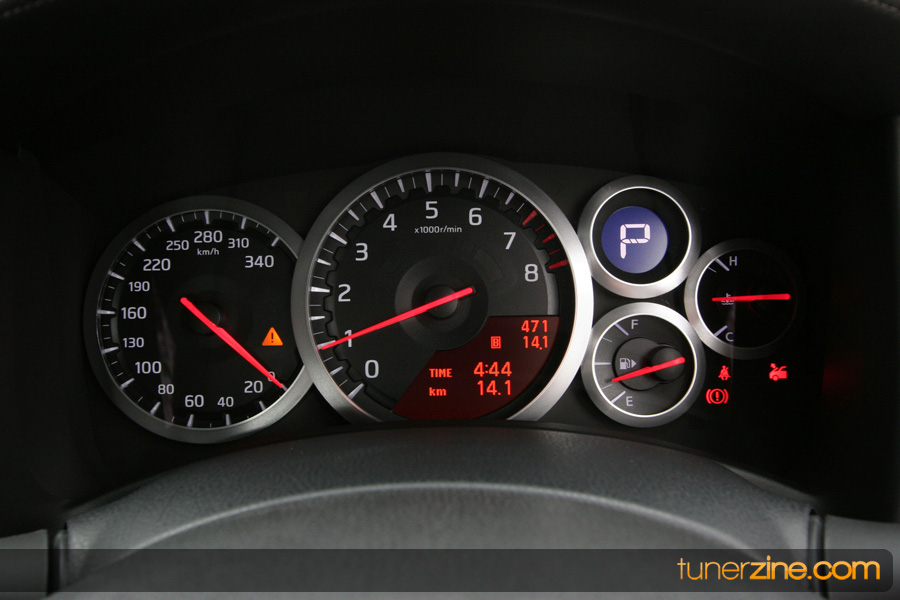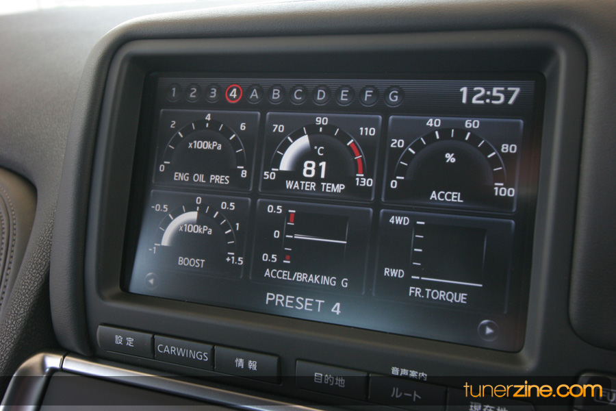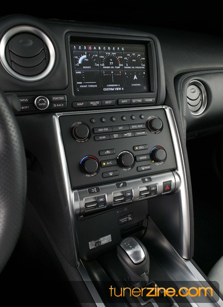 A cockpit-style instrument panel surrounds the driver, with all meters and multi-function meter at a uniform height to minimize the driver’s head movement. A large center-mounted tachometer, with gear display on its upper right, as well as the easy-to-read graphics of the display, gives the driver instant detailed information, essential for the performance nature of the GT-R.