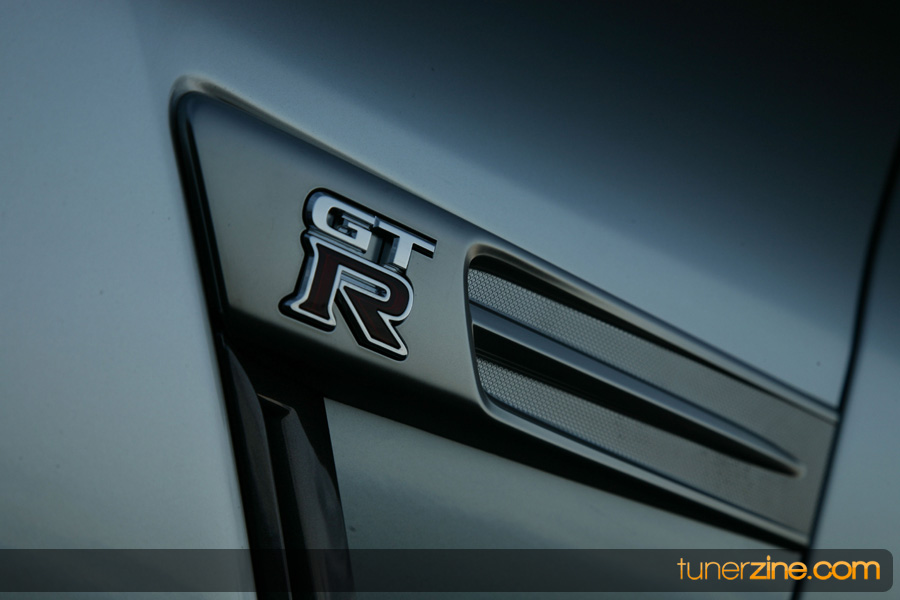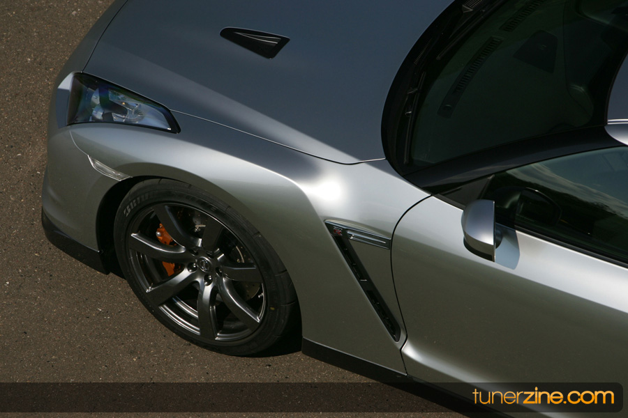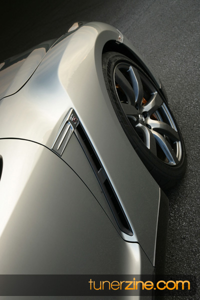 GT-R’s front fenders express power and stability, while the “aero-blades” on the fenders’ leading edges provide optimum airflow around the tires and along the body. The vents in the fenders’ trailing edges assists in providing front downforce and optimizing side air flow. The aggressive front end, with a large hood budge and single central air intake, provides a sophisticated style as well as undisturbed air flow for power and cooling.