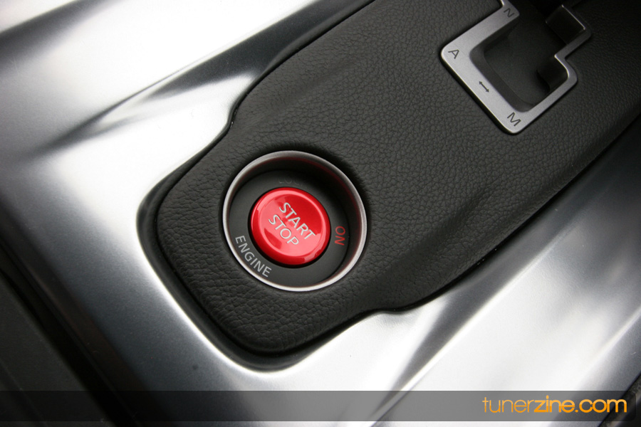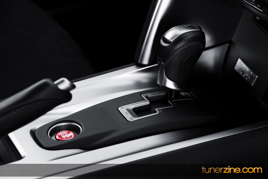 Functional style is also evident in GT-R’s interior – each meter features a dial plate design that evokes the idea of engaged gears, as well as a three-dimensional metal-like ring, suggesting the multi-dimensional performance of GT-R. A large, metallic-framed center console features an ergonomically designed shift lever and a red “engine start” button.