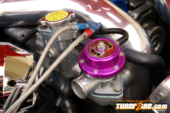 Underneath the hood this RX-7 isn’t lacking either. An upgraded twin turbo kit from GReddy as well as an NX Express EFI kit gives this rotary plenty of punch. A GReddy intercooler as well as blow off valve and polished intake gives room this force induced motor room to breathe. A custom exhaust leads out the rear with quad tips warning all passer bys what this RX-7 is capable of on the streets.