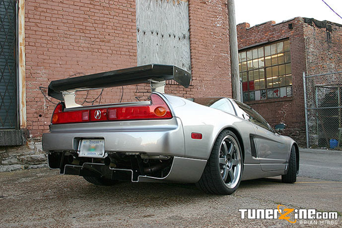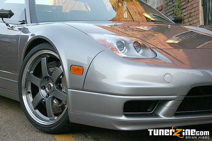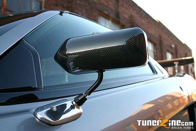 Powertrain, check. Exterior? Hmmm… the NSX has exotic and attractive lines as it is – but it’s mild in the eyes of many people. John added a more aggressive touch and some JGTC influenced styling to the body of his NSX. On the rear is a Taitec carbon kevlar rear diffuser. This thing just totally sets apart the NSX and shows that it means pure business from the rear. John opted to have it match painted to the rest of the car, flowing evenly from bumper to bumper. Sitting on the trunk is a Taitec JGTC 500 carbon fiber wing. More Taitec JGTC styling comes in the form of carbon fiber rear view mirrors that totally set off the side of the car. Keeping the front end relatively stock, John had the front spoiler match painted as well. The body itself has also received a modest weight reduction – this NSX weighs in at about 2840 pounds, making it one of the lightest full body NSX T’s out there in the US.