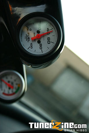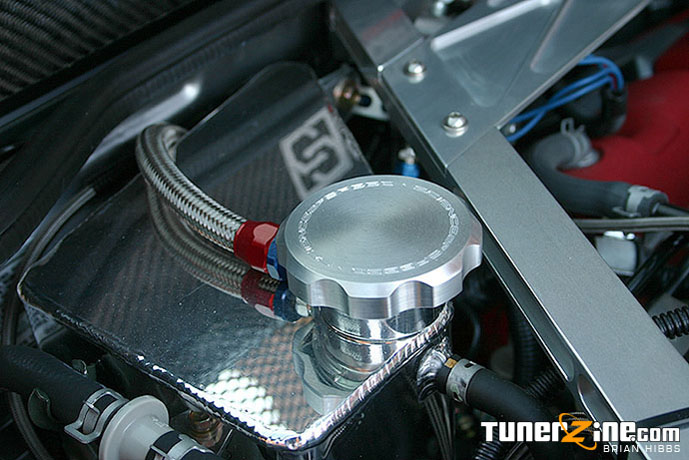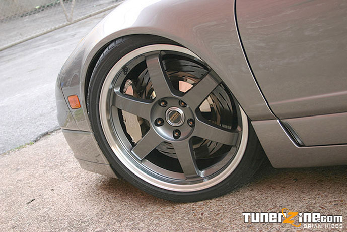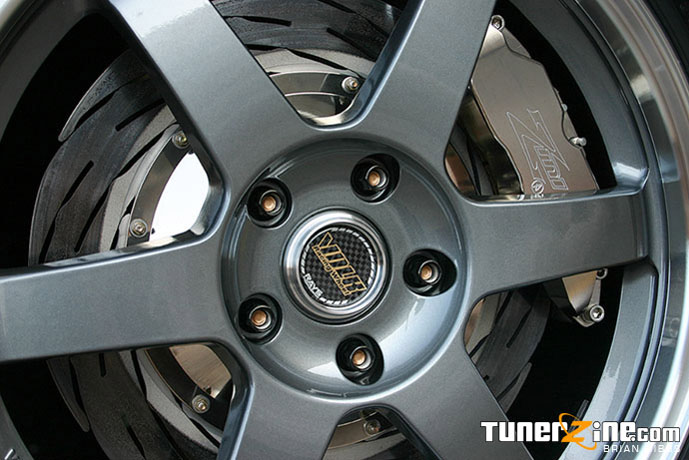 John spared no more change when it came to the suspension and brake setup on this car. It just straight screams out woah. A custom titanium rotor brake setup is seen behind the custom Volk LE37T’s. Up front are 14 inch rotors (that weigh in at 5.5 lbs!) and 13 inch rotors in the rear (measly 4.5 lbs!). These lightweight titanium rotors are hidden behind 18×7.5 / 18×9.5 gunmetallic LE37T’s wrapped with none other than those Bridgestone Potenza Pole Position S-03 rubber. 225/35/18 in the front, and a thick 285/30/18 in the rear. The car handles like a track bred monster thanks to a set of TEIN RA coilovers. A Comptech strut bar can also be seen in the rear to balance any last minute suspension issues.
