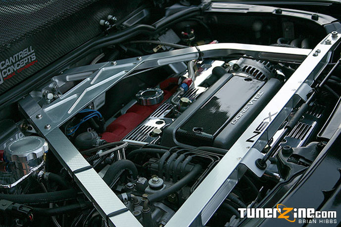Powered by Honda’s own V6 motor, John decided to pep it up just a tad to really smoke the competition in style. Starting off with none other than Comptech headers, John bolted the shiny wonders to the head. Feeding out all the exhaust is a lightweight Taitec JGTC exhaust system. By now most of you have heard of the JGTC craze that is about to hit the stateside. A lot of the JGTC influence was brought onto John’s NSX. Perfecting both track and street performance, John also installed a Pro Car Specialties (of Germany) carbon fiber air box and intake scoop onto the NSX. For the quarter mile straight guns, John has opted for an NX custom 100 shot wet kit to boost the NSX. Getting all the power to the ground is a Comptech Power Grip II clutch and lightweight flywheel design. Changing up the gear ratio just a tad and ensuring the car handles like a pure wonder, John swapped out the stock gears for an NSX R 4.235 gear ratio along with the NSX R rear differential. Last but not least, the rear engine bay has received a nice fresh Cantrell Concepts carbon fiber engine cover, along with polished injector covers, wire shroud and aluminum overflow container.