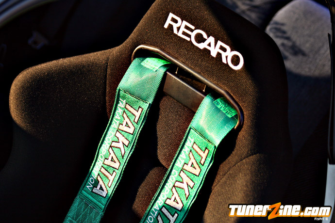Fastening yourself in the USDM Recaro seats with Takata harnesses, a Skunk2 short shifter and shift knob fits comfortably in your right hand. Firing up the ignition, the Pioneer head unit comes to life, feeding power to the two Earthquake amplifiers that in return emit a symphony of sound through four Audiobahn mids and an Audiobahn 12″ subwoofer. The 1.8 LS motor receives additional horsepower and torque thanks to a Racing Sports Akimoto intake that flows air through the head and into a JG Pro Flow header. Connecting from the cat-back is none other than a GReddy SP exhaust system.