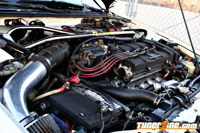 With the exterior complete to the owner’s taste, the DA was in line for a new suspension package. Sprint springs along with a set of Tokico Illuminas adjustable shocks found their way onto the car. A Progress camber kit was then added, allowing adjustability and preserving tire wear. Fastening up the chassis in the front and the rear is a Neuspeed front upper strut bar and a set of Skunk2 rear upper strut bar and lower rear tie bar. With a stiffer suspension setup the Integra was ready for a new set of shoes. Ordering a set of bronze Volk TE-37s to contrast the rest of the car, the 16×7 lightweight forged wheels were wrapped with 205/45/16 Kumho Ecsta Supra rubber. Peeking behind all four wheels are Brembo cross-drilled rotors and EBC brake pads wedged between the calipers.