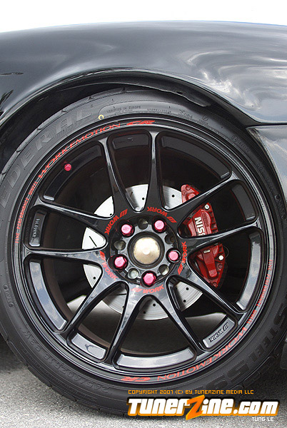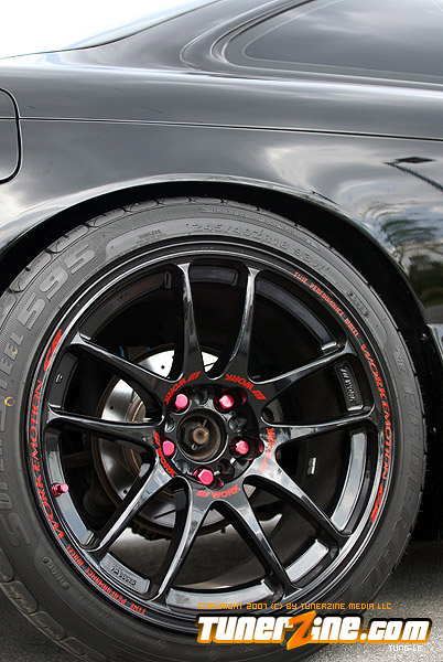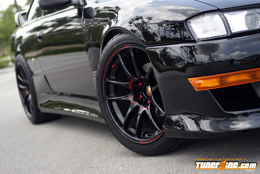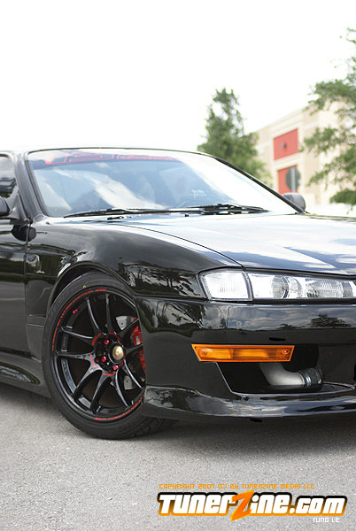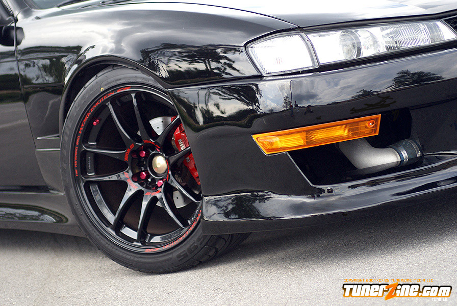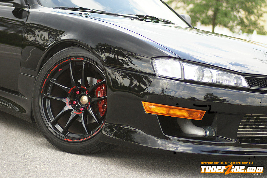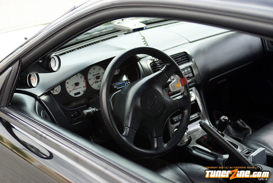 Behind each of the aggressive Work Emotion CR Kai wheels gleams 300ZX Twin Turbo calipers and Brembo cross drilled and slotted rotors. The S14 has been lowered with Eibach Sportline springs. The interior of the S14 has been kept mild, with a series of Autometer gauges, carbon fiber inserts and a Nismo GT shift knob. The stock steering wheel has been swapped out for its JDM counter part.