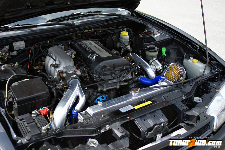 Under the hood, giving this black bomber plenty of power is a S14 Black Top SR20DET engine swap. GReddy’s entire catalog of go fast goods was then bolted on; including a GReddy V-SPL front mount intercooler, 3-inch downpipe, hot pipe, pulley kit, Airinx air filter and 1.2mm head gasket. Controlling boost and ensuring that the motor is at a reasonable temperature prior to shutting off is GReddy’s PRofec-B boost controller and turbo timer. Handling the rest of the exhaust on this S14 is a 3-inch test pipe that leads out of a 3-inch A’PEXi N1 exhaust system. Cooling has been upgraded with a Koyo aluminum radiator and Flex-A-Lite dual fans. The necessities for any SR20DET swap are also present, the Walbro 255lph fuel pump and HKS SSQV blow off valve.
