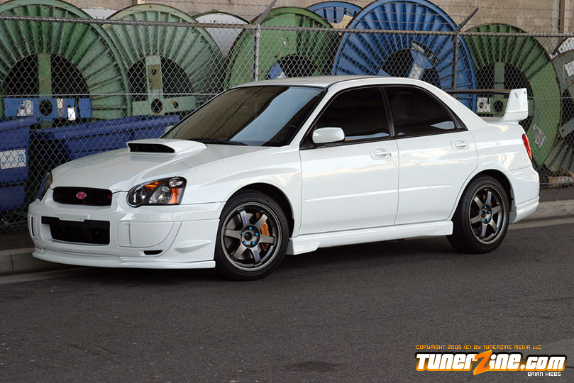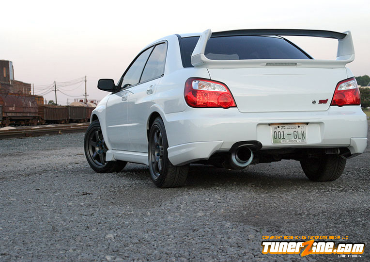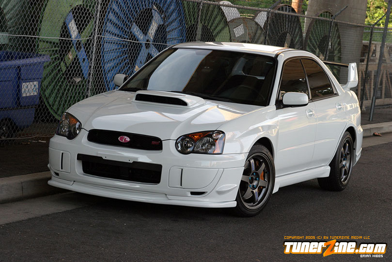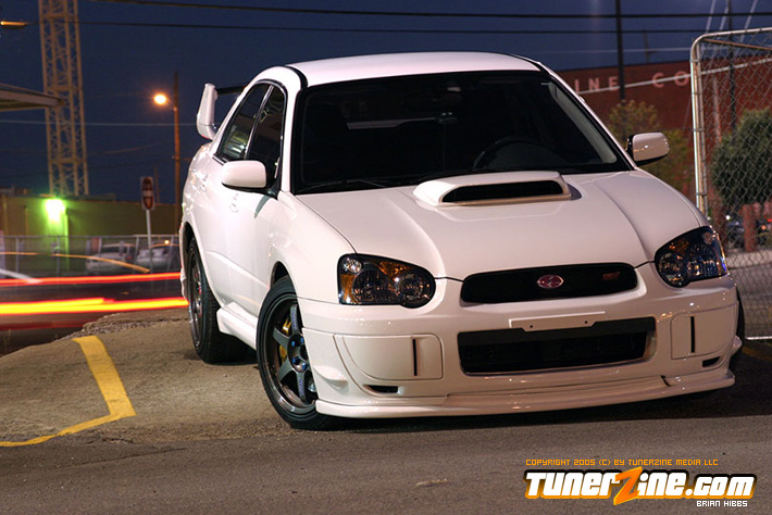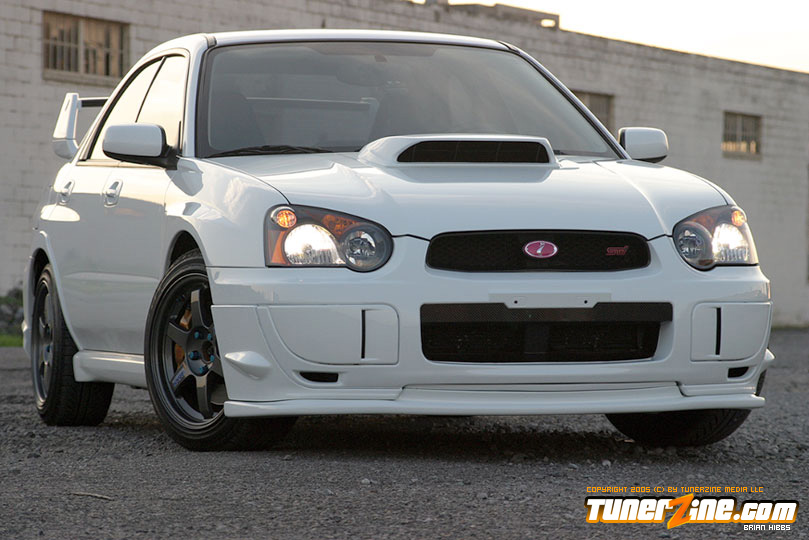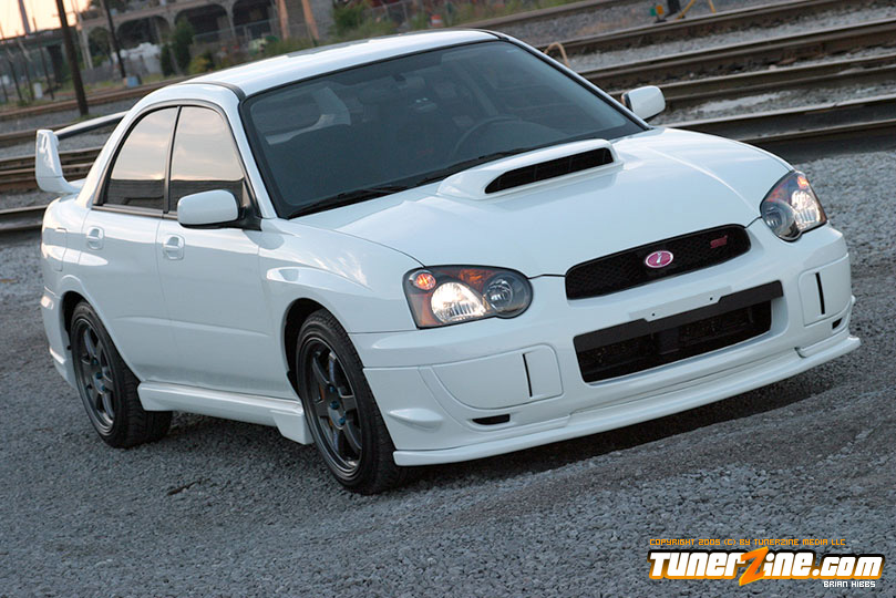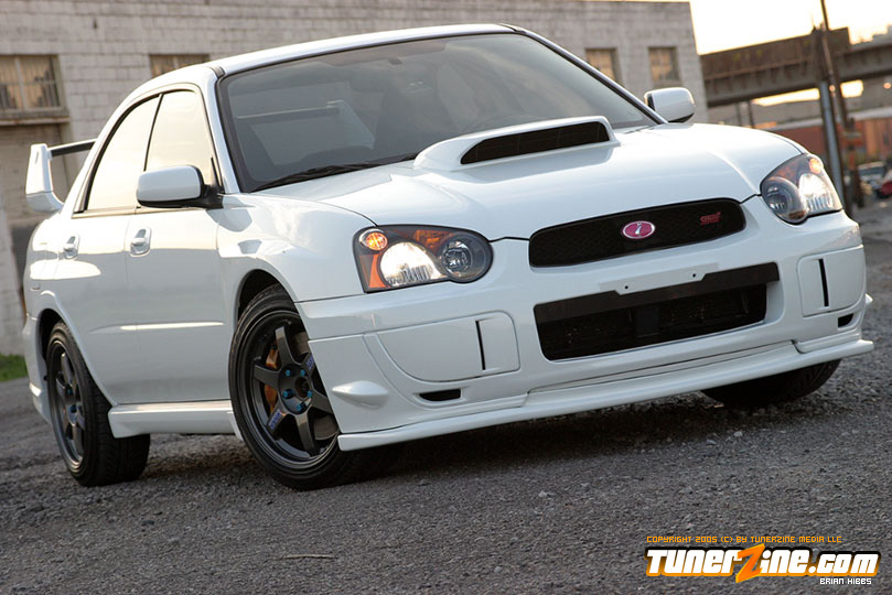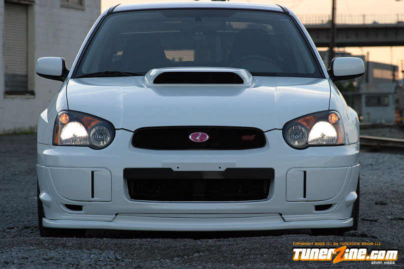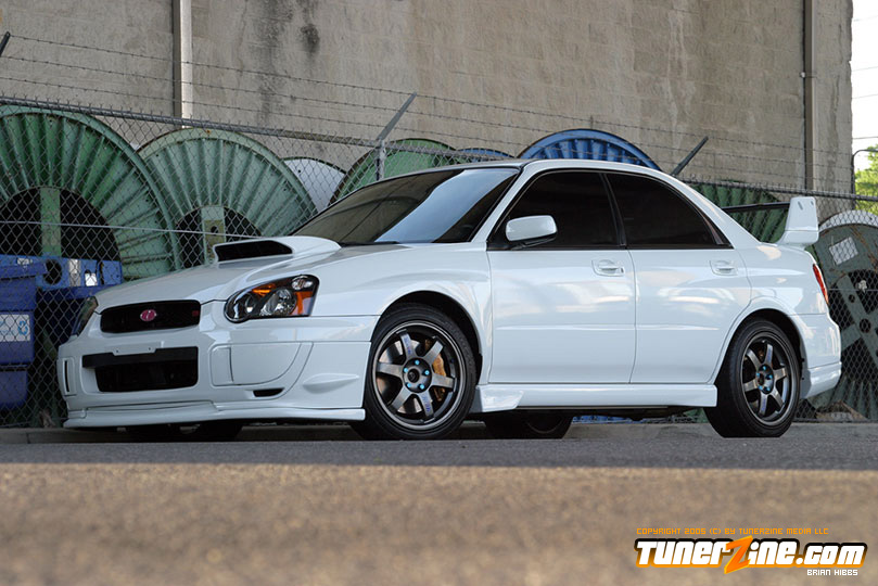Starting with the exterior, the STi has already been repainted with an Aspen White paint job with extra coats of clear. A Seibon S203 lip accents the front while the stock STi sides were replaced with WRX side skirts. Out the rear, a set of JDM 05 rear aprons were tagged on prior to paint. Carbon fiber goods come from a Syms wing and APR carbon fiber bumper garnishes.
