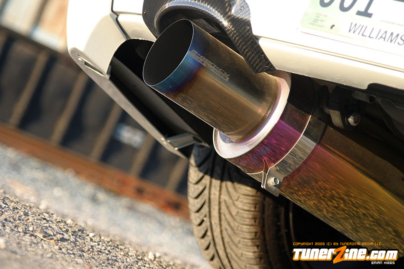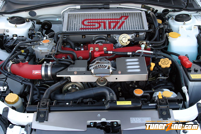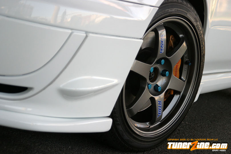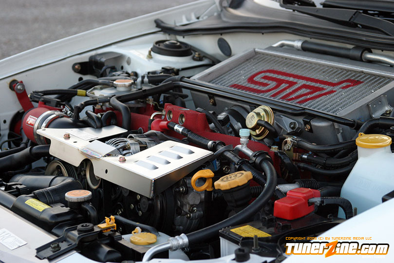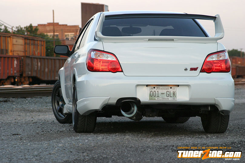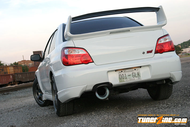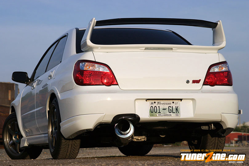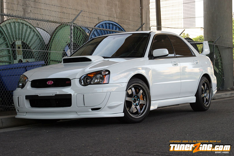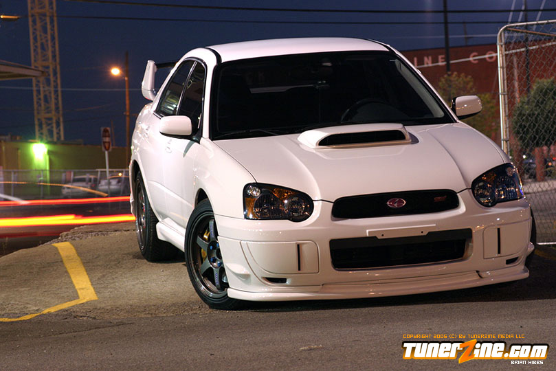 Starting with the exterior, the STi has already been repainted with an Aspen White paint job with extra coats of clear. A Seibon S203 lip accents the front while the stock STi sides were replaced with WRX side skirts. Out the rear, a set of JDM 05 rear aprons were tagged on prior to paint. Carbon fiber goods come from a Syms wing and APR carbon fiber bumper garnishes.