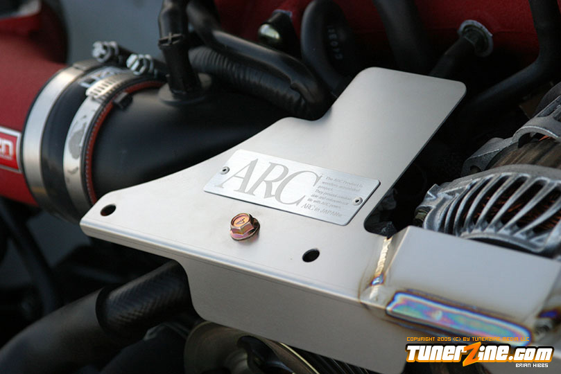 Under the hood, the turbocharged motor has received some extra power thanks to some goods from Injen. A wrinkle red intake along with Injen’s SES downpipe leads out to a 3-inch exhaust system from Agency Power. Decked out in titanium, Agency Power’s cat-back exhaust was exactly what this STi needed. Accenting the engine bay is an ARC pulley cover and Titan hood panel. Tuning the car right now is a Cobb Accessport containing a stock Cobb Stage 2 map.