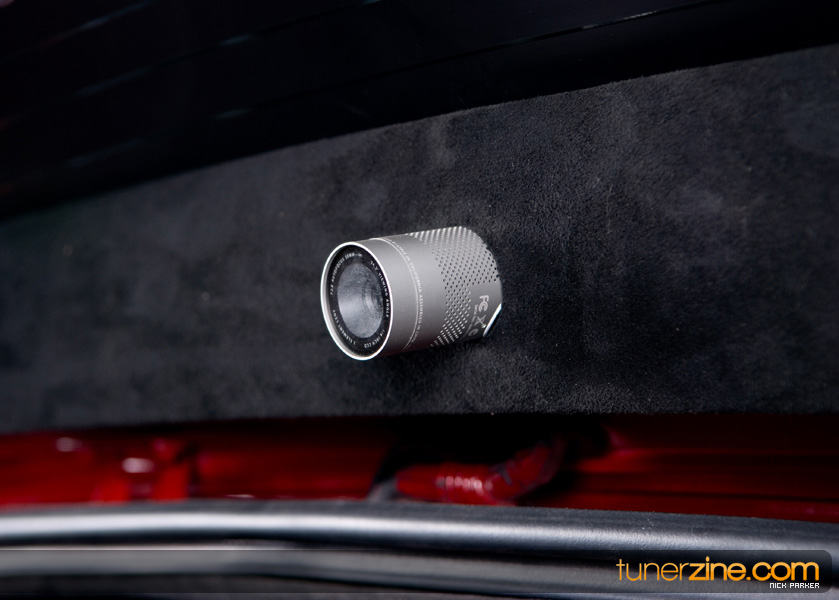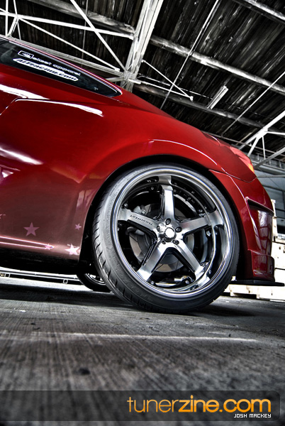 Starting with the exterior of the car, this tC has been completely transformed. The majority of the body has received new panels thanks to AIT Racing’s K1 8-piece wide body kit. Cynce opted to have the entire kit molded onto her car to make it as clean as can be. Complementing the entire wide body kit are AIT’s front and rear bumper carbon fiber splitters. To make the rear even more aggressive, APR’s carbon fiber rear bumper diffuser was incorporated to the wide body machine. Up front, Kaminari goods entered the equation with their reverse cowl carbon fiber hood and honeycomb upper grille. It was then off to the paint shop where Cynce really put her personal touch to the project. Her decision started with a repaint of the car to a House of Kolor Candy Apple Red, but that wasn’t enough. Air Syndicate Pearl Star painted accents were then added, giving Cynce the spice she needed to really relate to her own project. After the fresh coat of paint was laid, new Izn Trbl custom projector HID headlights were bolted in and two-color vinyl graphics were laid.