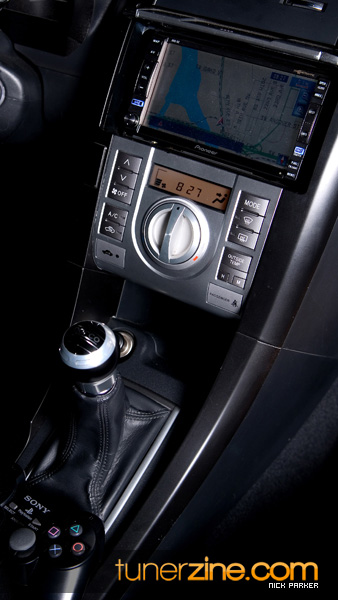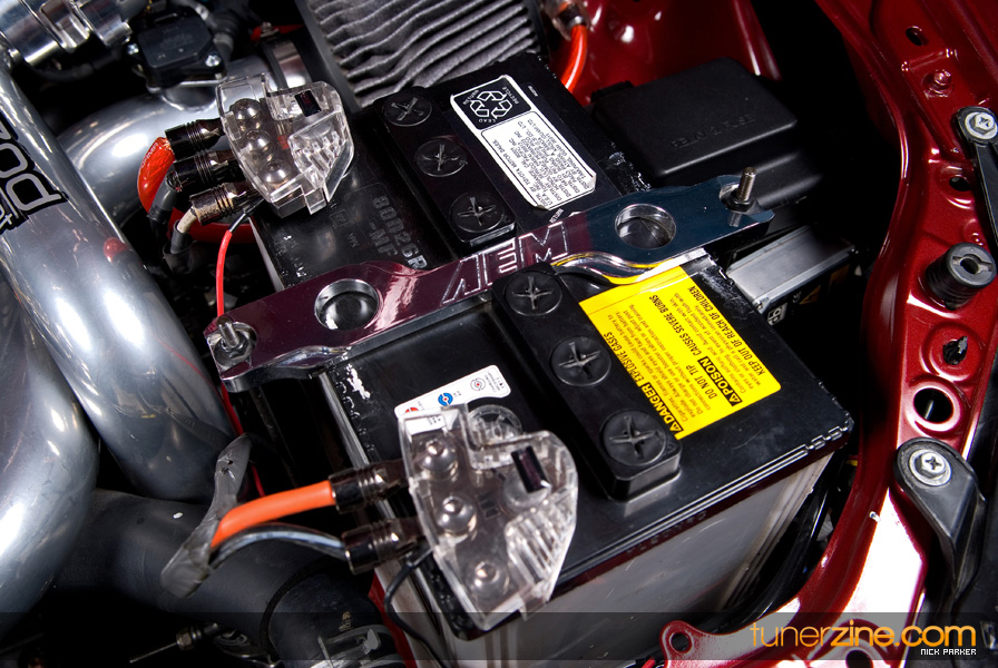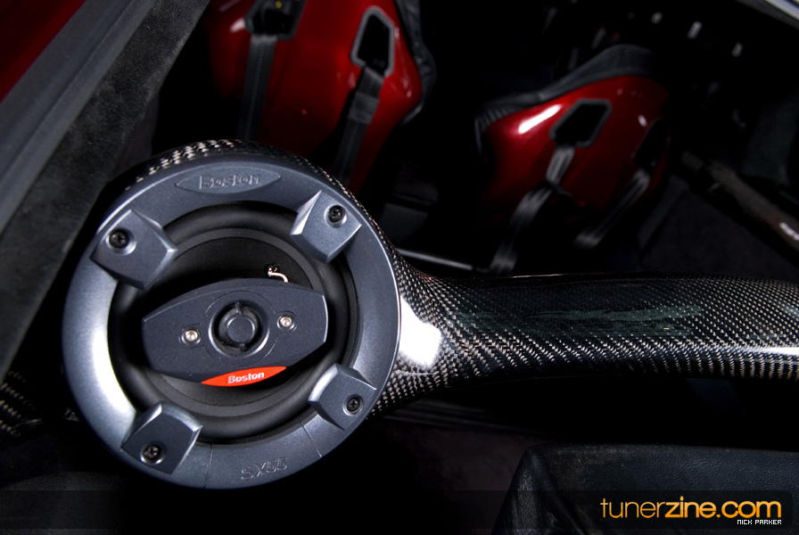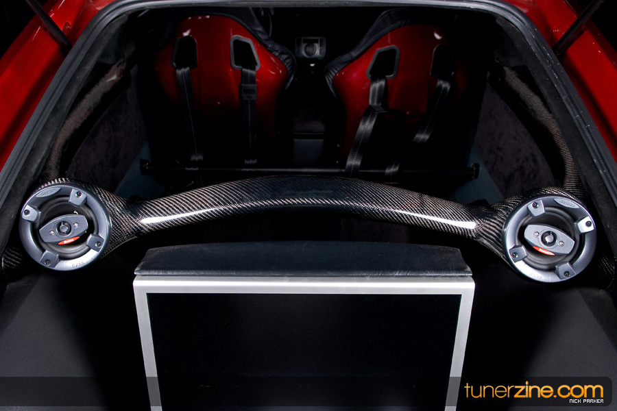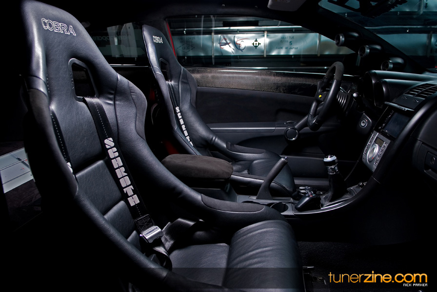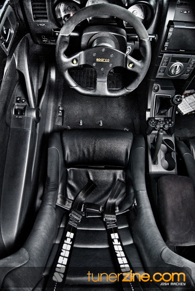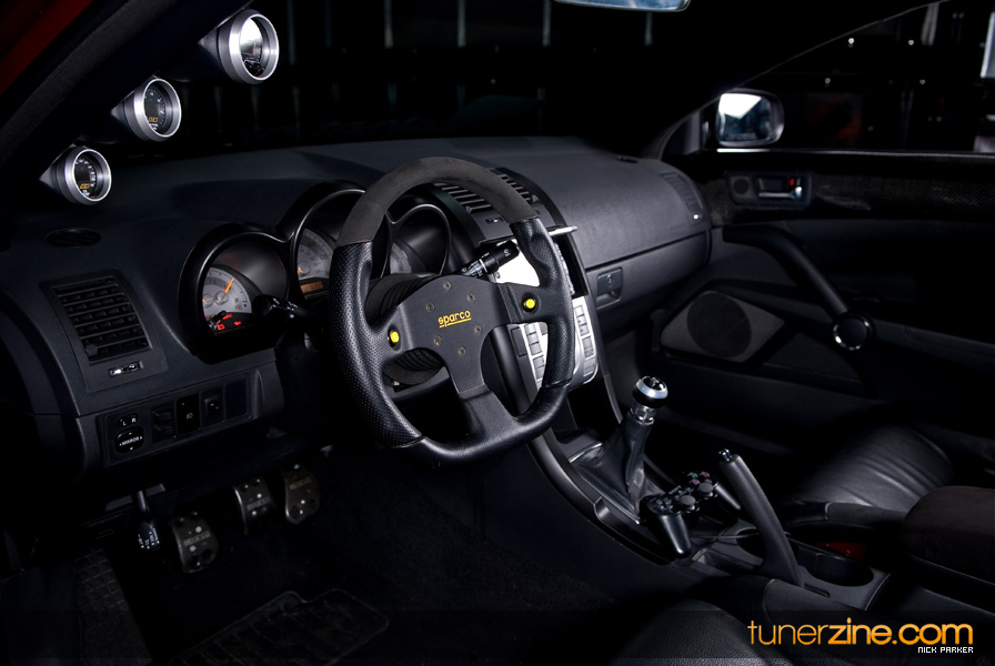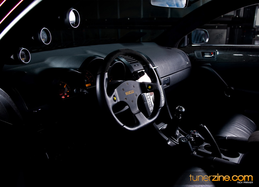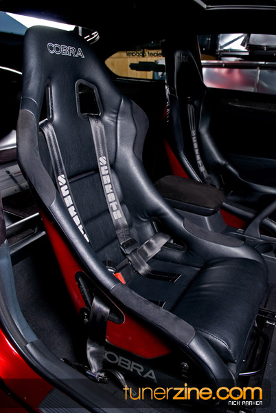 Stepping foot into the interior of the car, we were overwhelmed by the race inspiration and attention to detail yet again. Cobra Imola S-GT racing seats now replace the front pair. Several covers have been rewrapped in leather and suede, while Sparco’s catalog of interior goods were clearly ordered up for this project. Carbon fiber pedals, Globe shift knob and Mugello steering wheel all carry the Sparco moniker. Carbon fiber accents can be seen throughout the car, while several gauges from AEM made tuning and monitoring simple. AEM’s Tru-Boost gauge controller along with their Wideband UEGO controller, Oil Temp gauge are all housed in a triple gauge pod.