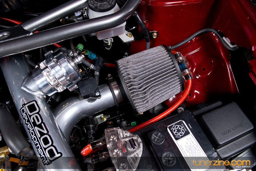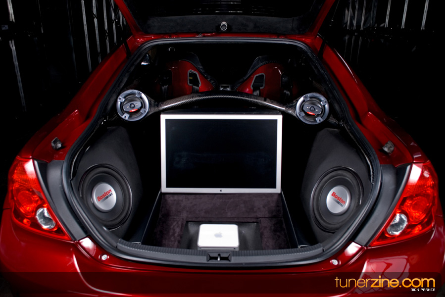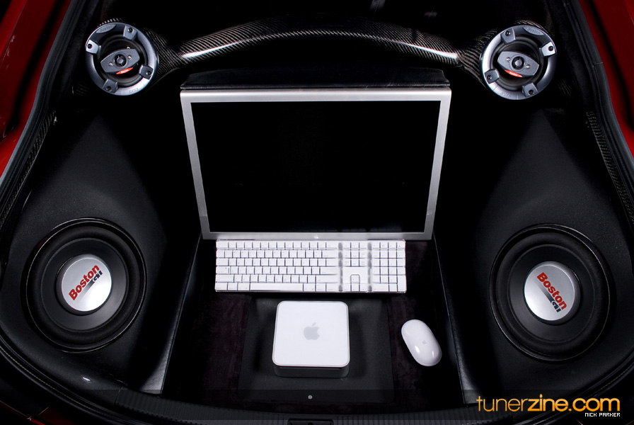 The interior modifications sort of stop there, that is if you don’t consider in car electronics as part of interior modifications. To competitively represent at the shows, Cynce has completely decked out the ICE component to this project. Up front is a Pioneer AVIC-D2 head unit providing entertainment and the first ounce of juice that flows to the rest of the system. A pair of Boston Acoustics GT2 10-inch subwoofers are in the trunk along with a trio of GT series amplifiers from Boston Acoustics. Six Boston Acoustics component speakers have been added into the mix, filling the cabin with plenty of musical notes. For additional entertainment, the rear custom fiberglass enclosure also houses an Apple Mac Mini computer, 23-inch Apple motorized LCD monitor, and Apple iSight web camera. If that wasn’t enough, a Sony PS2 along with a 15-inch SonaVision LCD monitor is also in there somewhere.