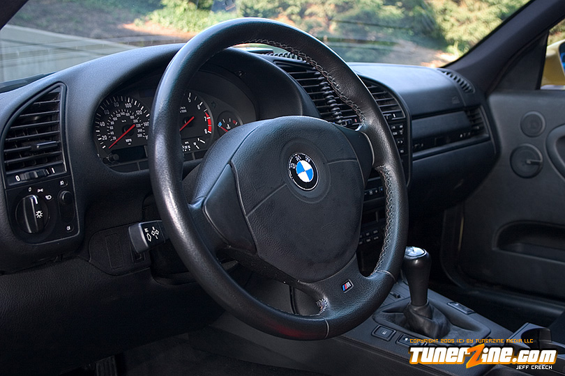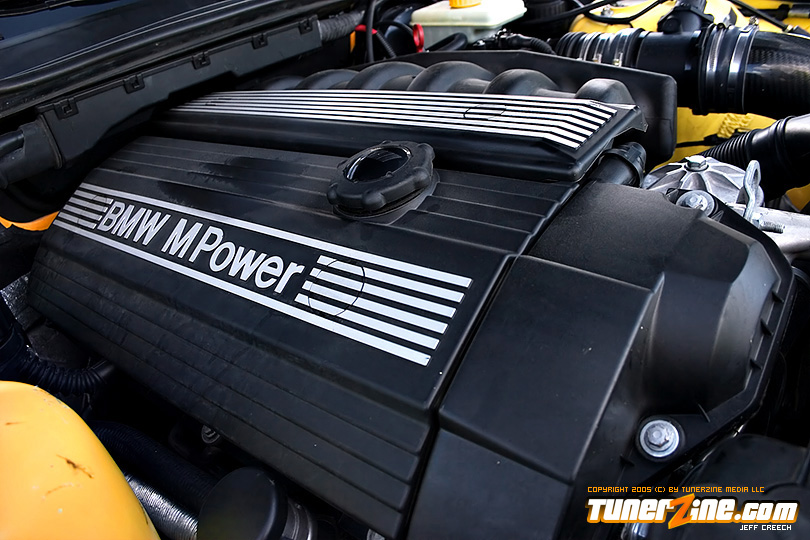 Backing up the intense yellow paint is a MA Shaw PTG Style Wide Body Kit. As a weekend road racer, this kit allows Sean to sport 315 Michelin PS2’s in the back (275’s in the front), adding a significant amount of traction which is vital for fast lap times. Located inside of the rubber are powder-coated 18 in Fikse profile 10 wheels. Hawk race pads ensure he can stop on a dime when needed. The bimmer is dropped on a TC Kline TCKR Smart Design D/A Race Suspension, a system that is rather brutal for the street, but works wonders on the track. Stiffening the suspension further is an underbody X-brace.