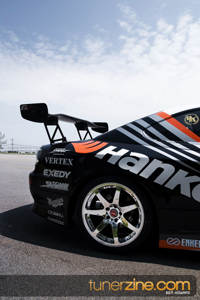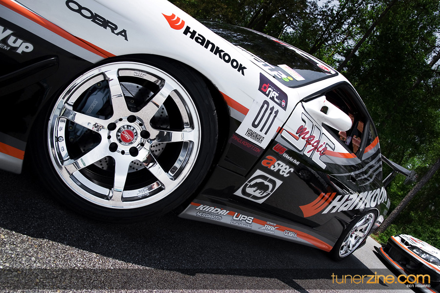During the qualifiers, Kenji impressed the judges with his clean drifting line and fast entry speed. He was clocked in at 75mph into the first main corner and got an overall score of 93.25 that secured him a spot of 7th place out of 32 drivers. Kenji had his adrenaline flowing as he came up to the first round of tandem battles against the Blue Bridgestone Tires V8 powered S13 driven by Mike Peters. In the first run, Kenji lead as Mike Peters followed. Kenji kept a consistent and clean line as he gained a 7-3 advantage over Mike Peters. In the second run against Mike, Kenji followed him closely. As they came up to the first line, Mike initiated the drift but ended up sliding into the k-rail and Kenji came out victorious to advance to the next round of tandem battles.