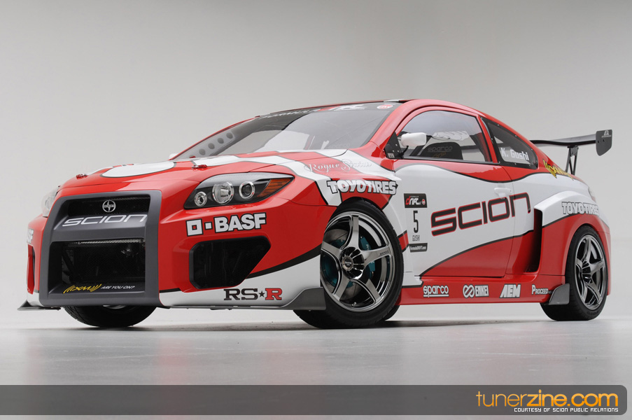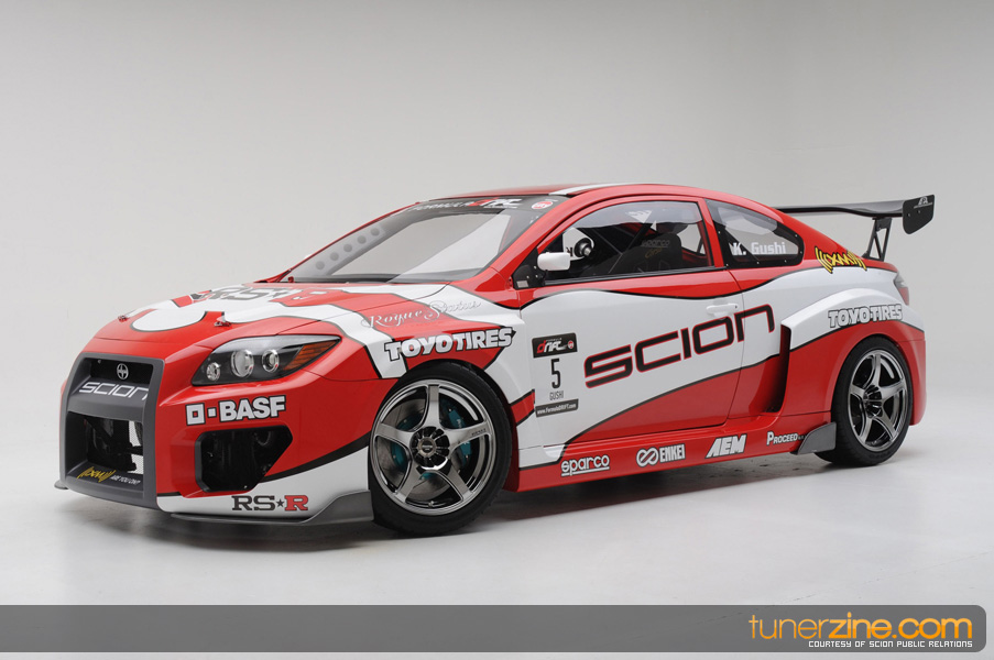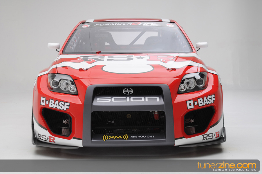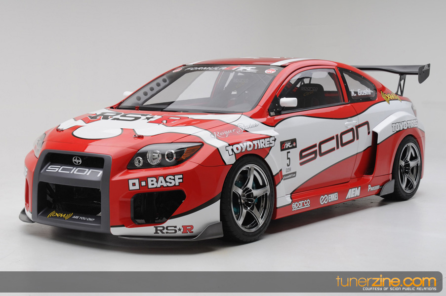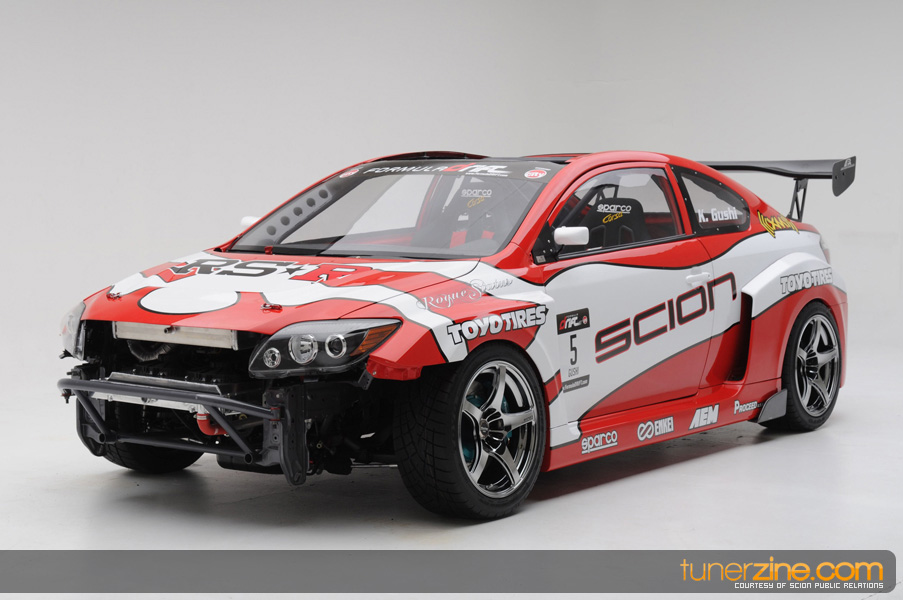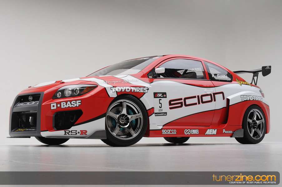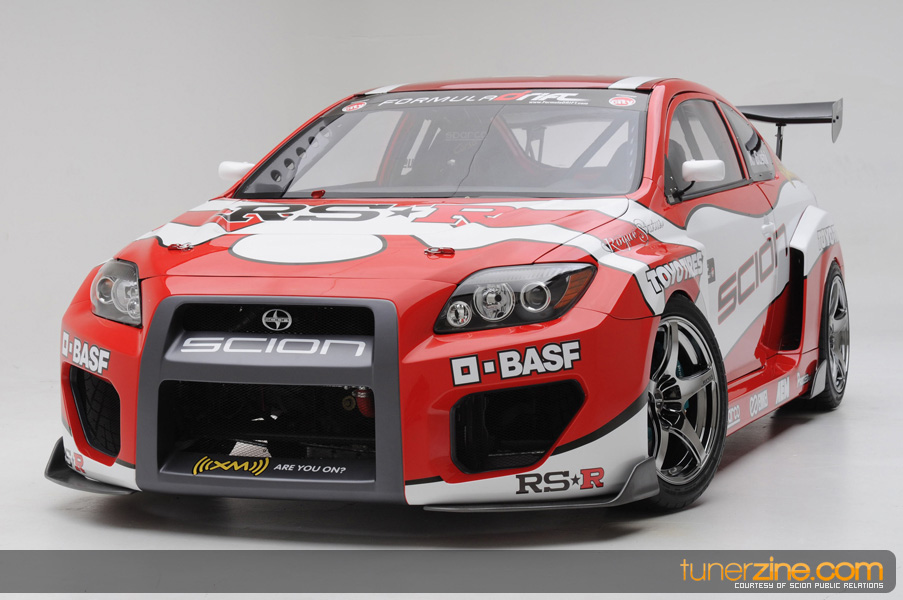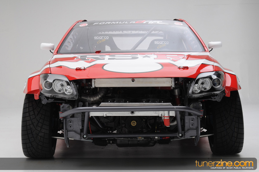 Scion’s drift car is based on its most popular model, the tC sports coupe. The factory built front-wheel drive tC turned into a drifting contender through a rear-wheel drive conversion performed by acclaimed exhaust and suspension manufacturer, RS*R. The tC shares its platform with Toyota’s Japanese market Avensis four-wheel drive and Caldina all-wheel drive, enabling it to undergo the conversion. RS*R used its extensive performance shop experience to change the tC’s stock transverse engine configuration to a longitudinal setup in order to drive power, through the transmission and drive shaft, directly to the rear wheels.