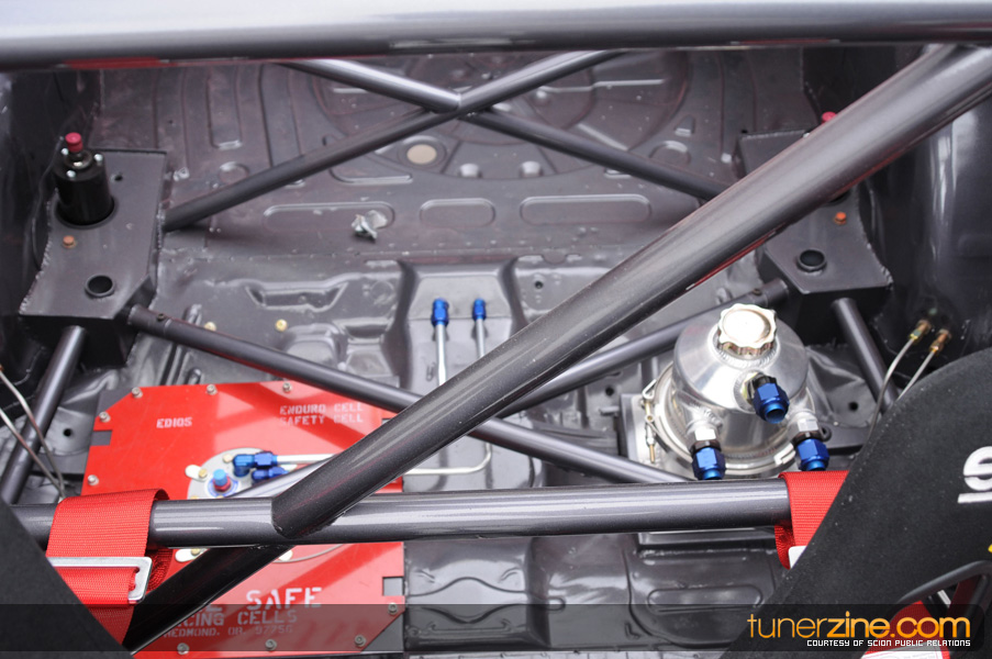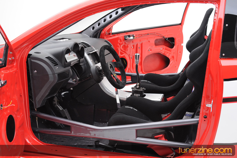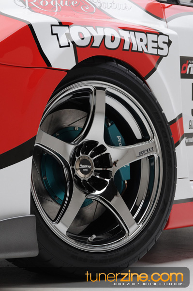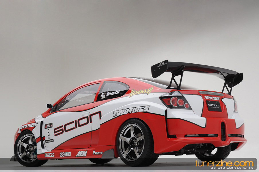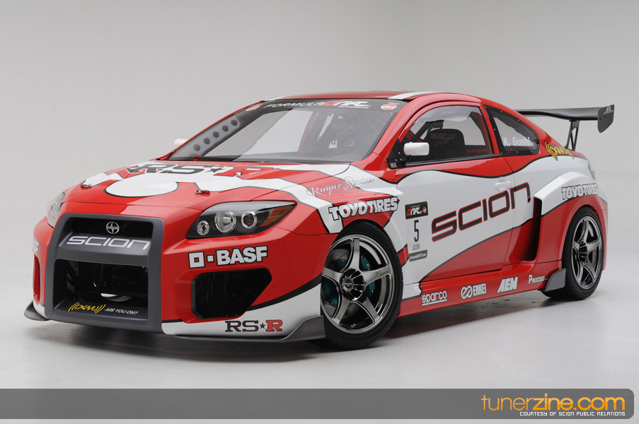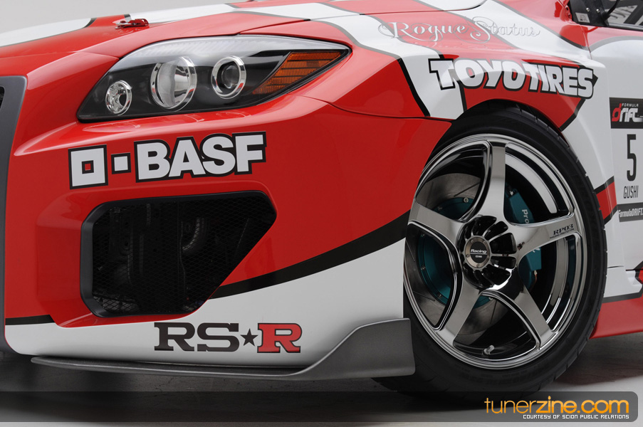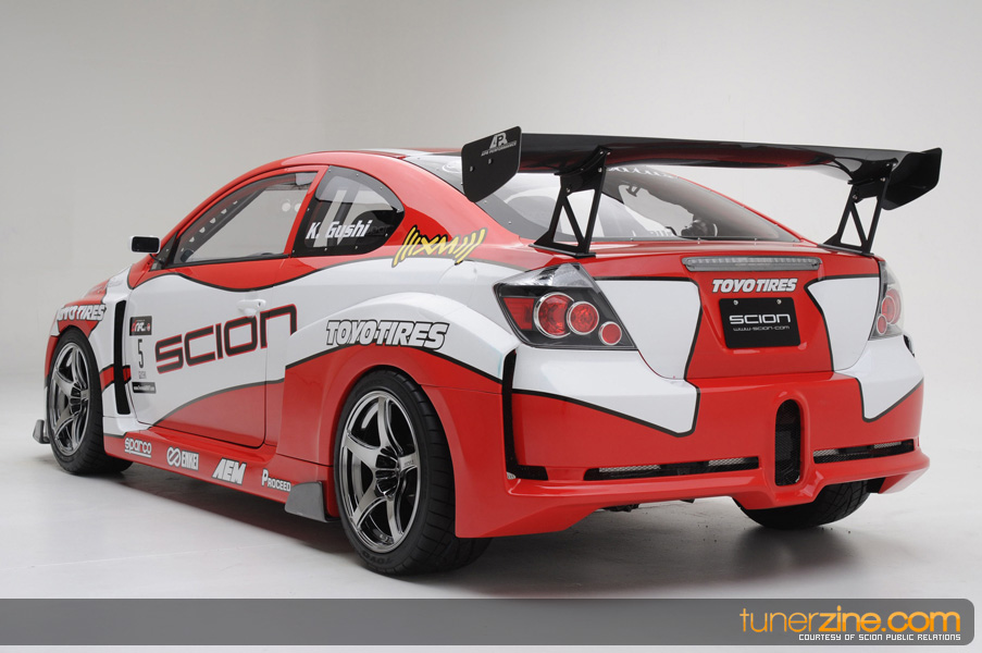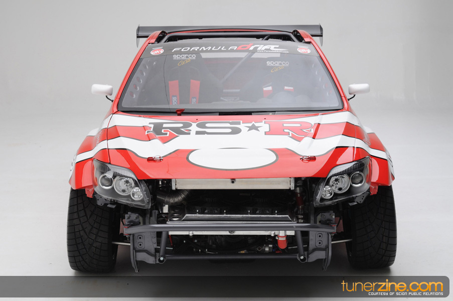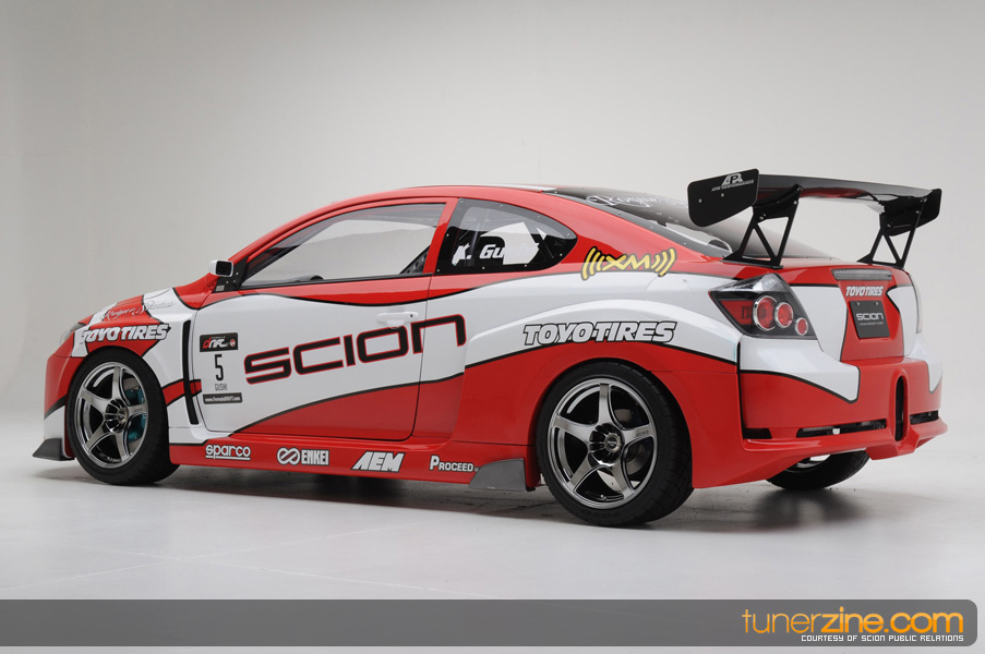 Scion’s drift car is based on its most popular model, the tC sports coupe. The factory built front-wheel drive tC turned into a drifting contender through a rear-wheel drive conversion performed by acclaimed exhaust and suspension manufacturer, RS*R. The tC shares its platform with Toyota’s Japanese market Avensis four-wheel drive and Caldina all-wheel drive, enabling it to undergo the conversion. RS*R used its extensive performance shop experience to change the tC’s stock transverse engine configuration to a longitudinal setup in order to drive power, through the transmission and drive shaft, directly to the rear wheels.