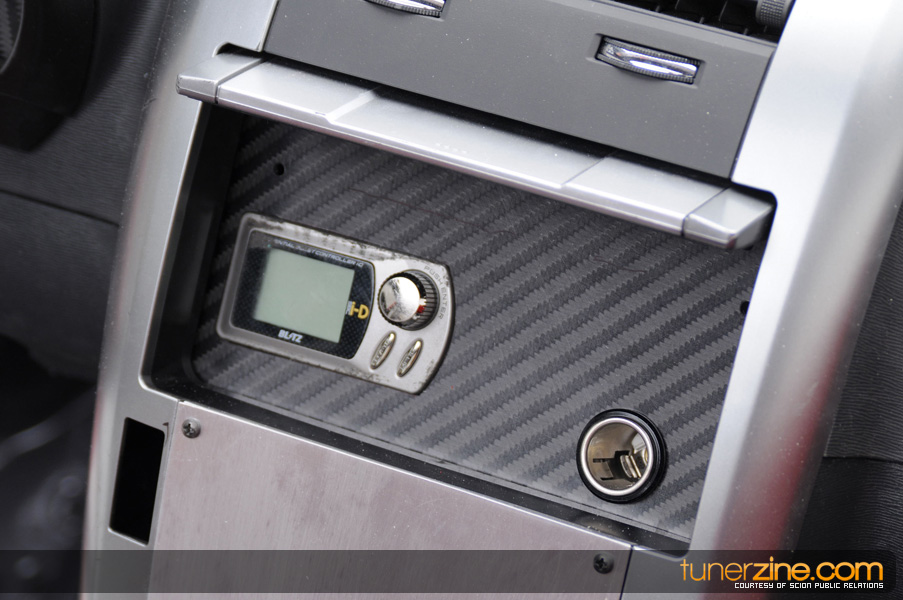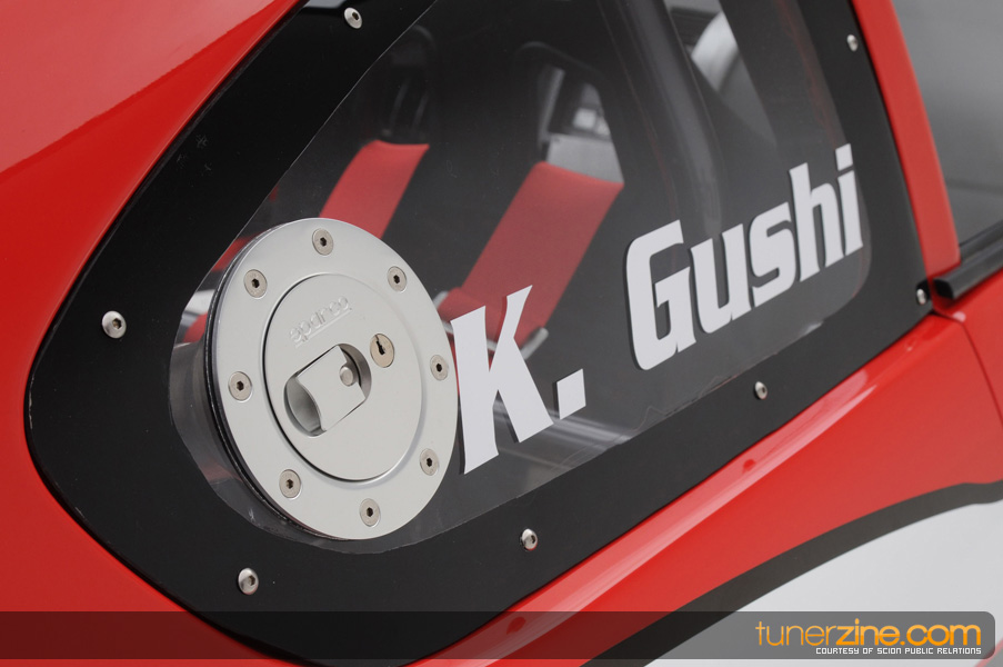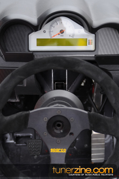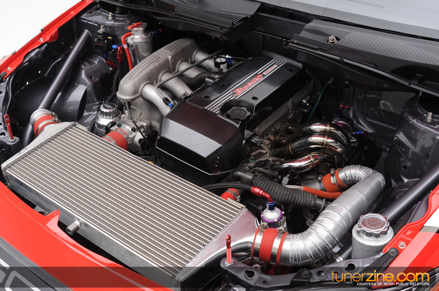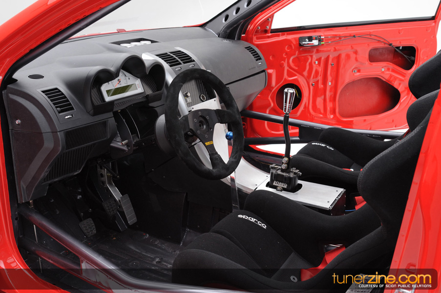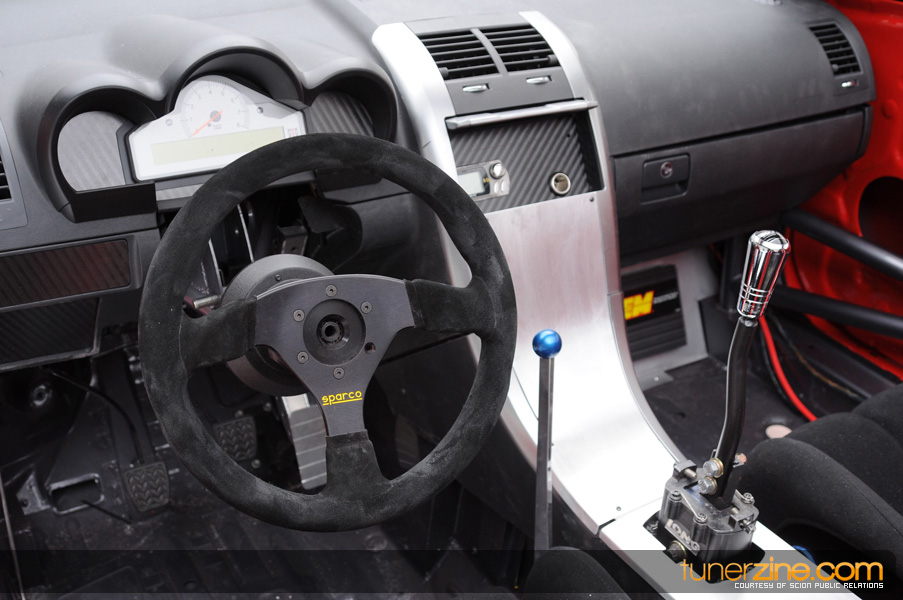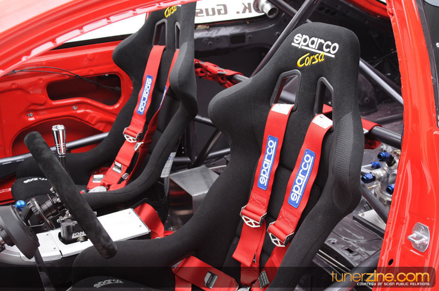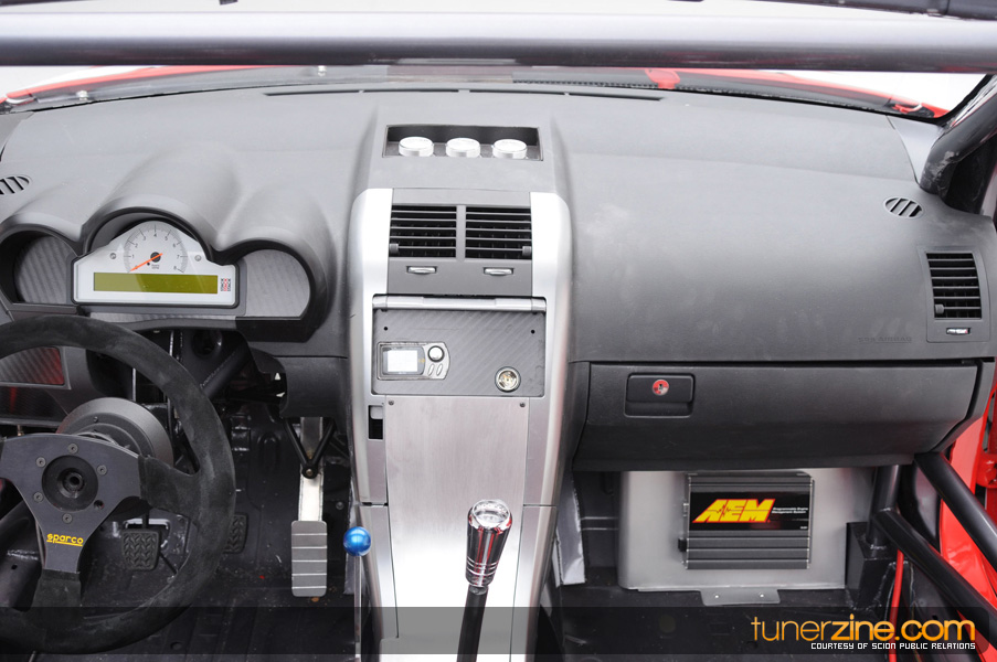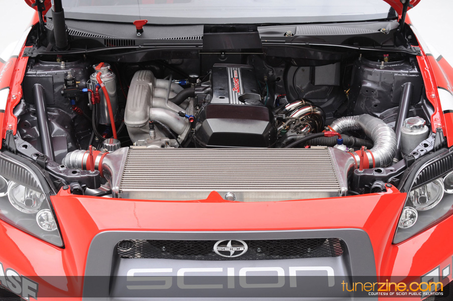 Scion’s drift car is based on its most popular model, the tC sports coupe. The factory built front-wheel drive tC turned into a drifting contender through a rear-wheel drive conversion performed by acclaimed exhaust and suspension manufacturer, RS*R. The tC shares its platform with Toyota’s Japanese market Avensis four-wheel drive and Caldina all-wheel drive, enabling it to undergo the conversion. RS*R used its extensive performance shop experience to change the tC’s stock transverse engine configuration to a longitudinal setup in order to drive power, through the transmission and drive shaft, directly to the rear wheels.