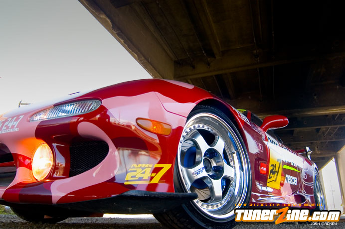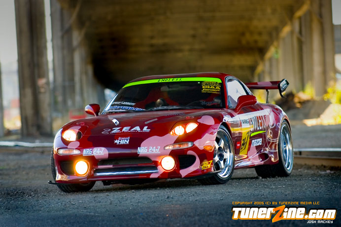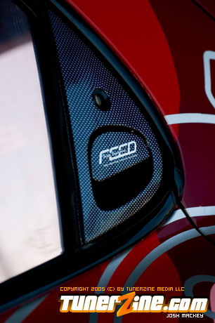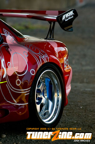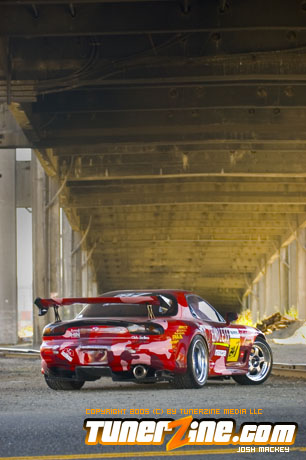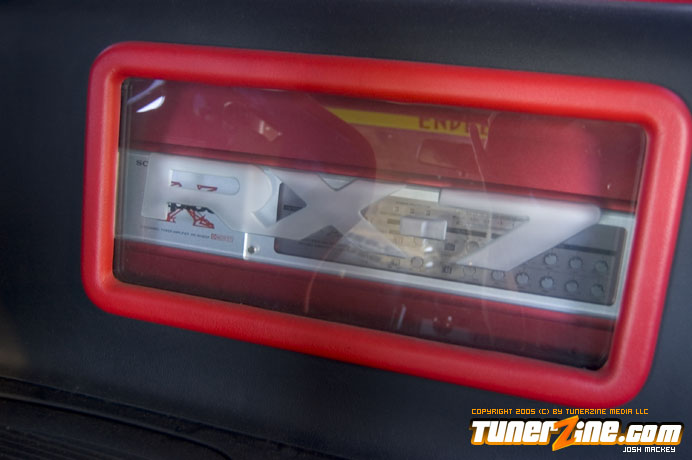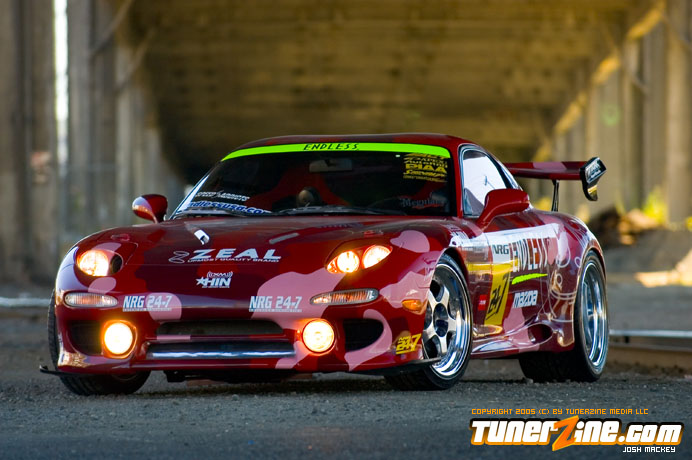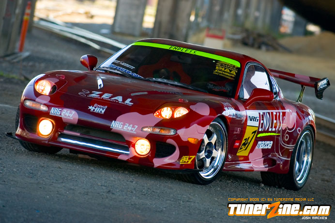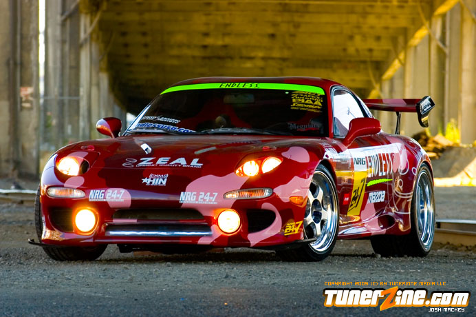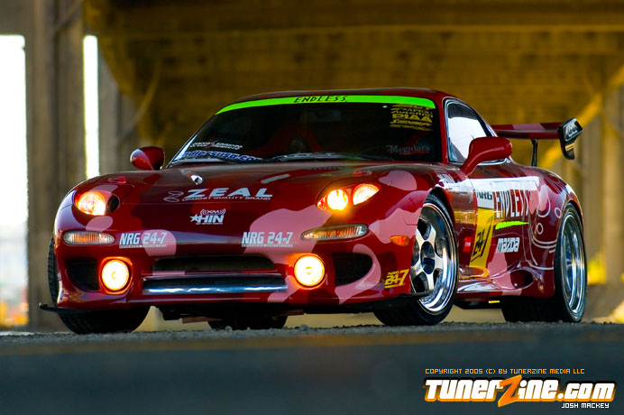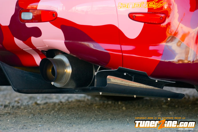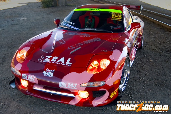 Inspired by Maharashi / Mazda / Bathing Ape, the paint scheme on this RX-7 arguably makes the car what it is. Run Racing converts the headlights and bolts on a new hood to match the styling of the APEXi front bumper. Pettit Racing flares out the rear fenders that were molded on while RE Amemiya side skirts and rear skirts accent the rear. Carbon fiber goods throughout the car as well as the Endless USA graphics designed by Kent Chen are the finishing touches on the exterior.