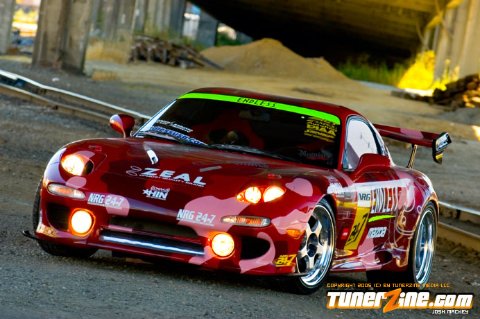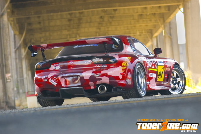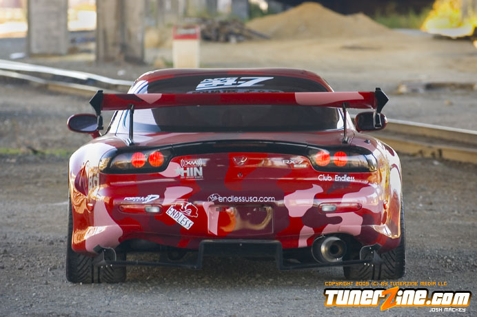 Over the years it has become more and more difficult to set your car apart from the crowd. Insane paint colors and headlight and taillight conversions were a craze at one point. Nowadays a lot of people stick with the clean, smooth look – but the insane paint is still there. Let’s face it; the first thing anyone notices is the color of the car. When Endless was building their RX-7 with Les Wong, they knew the exterior had to be eye popping. The result was an eCamoflauge paint scheme devised by M1 Autobody and the result is more than sufficient.