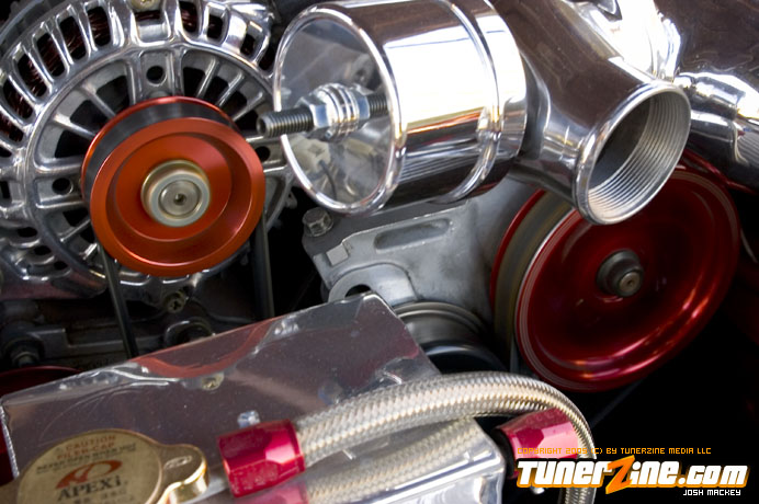 Underneath the hood the RX-7 has plenty of power to boot. With nearly 350hp to the wheels, Signal Auto Japan’s expertise tweaked the APEXi Isamu RX6 ball bearing turbo kit to perfection. A custom drift circuit v-mount intercooler is seen in the engine bay rather than behind the front bumper. Additional fueling is supplied with RC 800cc and 1300cc injectors, while an HKS F-Con Pro piggyback system helps tune.
