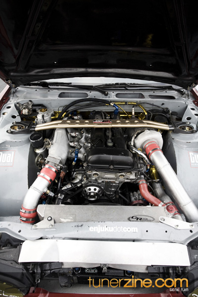 On the interior, this S13 is all business sporting the necessities for any true race car. Starting by completely gutting out the interior and equipping it with a full Mazworx cage, a basic necessity for any drift car, Sparco EVO seats along with a Nardi Steering Wheel made Sherman’s piloting job much more comfortable. K-Sport’s hydraulic hand brake and a B&M short shifter also offered plenty of utility as they drifted their way to the championship. None other than AEM’s electronics including their serial gauges and EMS was used to tune their car to perfection. Just how perfect? Well, with the AEM EMS’ help, this fully built 2.0L race motor easily produces 530whp.