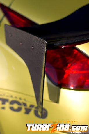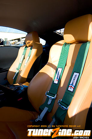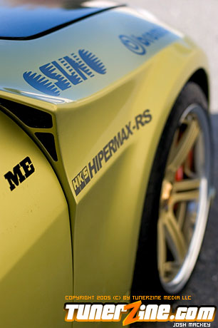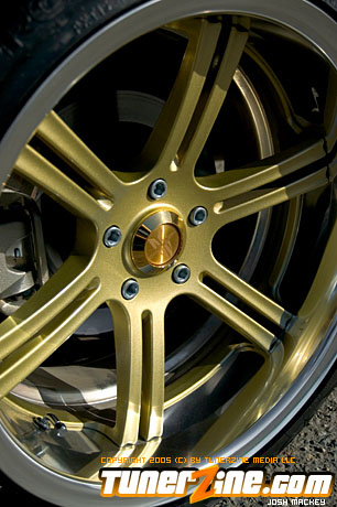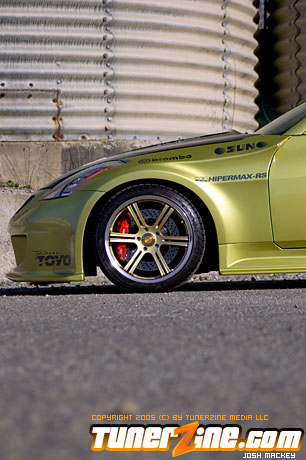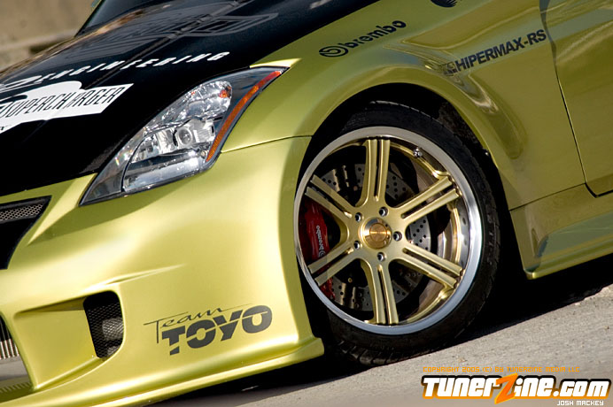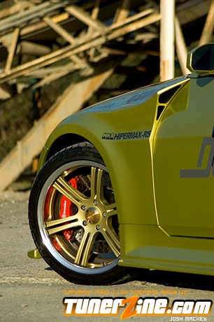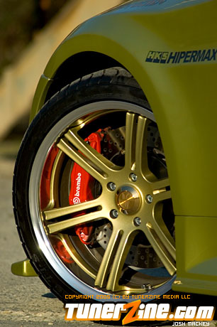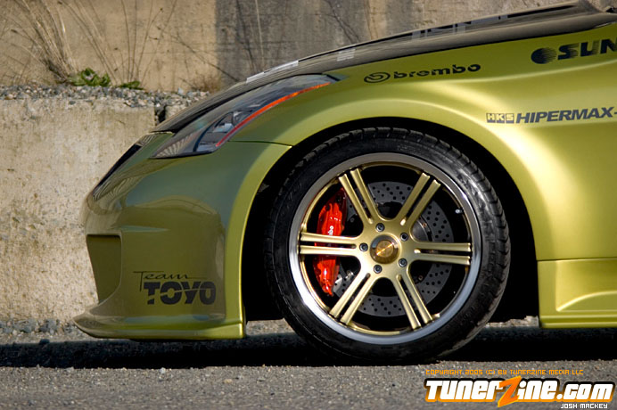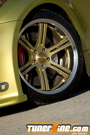 Seeing the huge possibility of the new 350Z, HKS designed a new Rotrex supercharger kit for the VQ powerplant. Just one of many methods to produce ample amounts of horsepower beyond the 280hp stock number, the HKS supercharger comes with an optional intercooler that Do Luck installed as well. Expelling all the force induced fumes is an HKS cat back exhaust system. HKS also designed and implemented their Hipermax RS coilovers to slam the 350Z to the ground. Being a coilover set, Do Luck is able to adjust height for shows and daily driving, as well as dampening for when the car gets ready to hit the course. On all four corners are Do Luck’s own Double Six wheels in a gold finish. This uniquely styled wheel is guaranteed to be one of the only kind out there and fits the 350Z just perfectly. Wrapped with Toyo T1S tires, the staggered 18×9 and 18×10.5 combination makes for a potent setup visually. Reinforcing handling is a set of Nismo sway bars for the front and rear. Lastly, a Brembo big brake kit was thrown on to make stopping in the 350Z as much fun as accelerating.