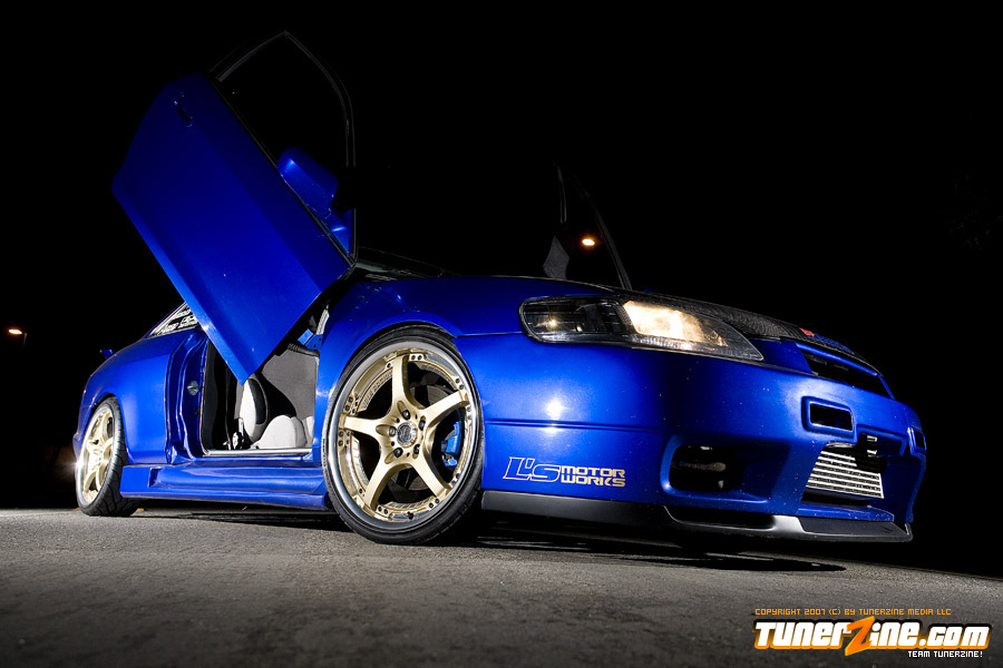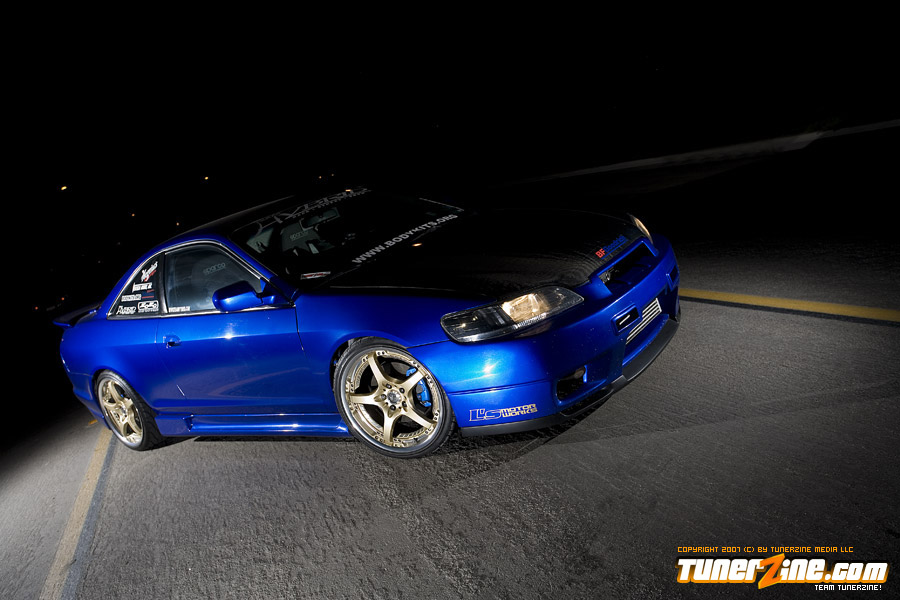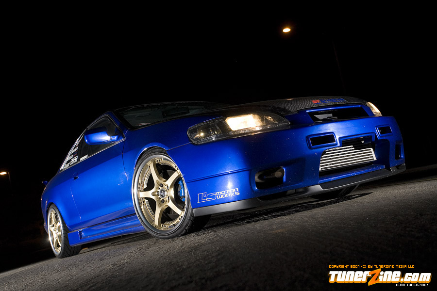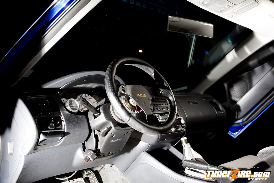 Under the hood a custom turbo kit was installed housing a Turbonetics T3/T4 turbo. Several more components from Turbonetics complement the turbo with their Evolution 35mm wastegate and Raptor Bypass Valve. A Spearco front mount intercooler fills up the Skyline R33 styled front bumper, which leads us to the exterior. On the outside the entire vehicle has been repainted a Long Beach Blue Pearl with a custom two tone front and rear bumper. A Seibon carbon fiber hood contrasts the blue tone while the rear has been decked out with a Ground Designs Black Widow spoiler.