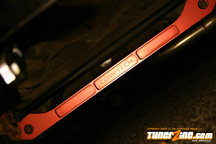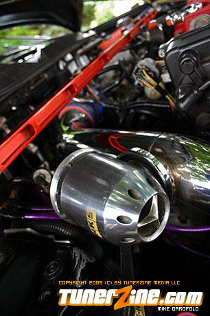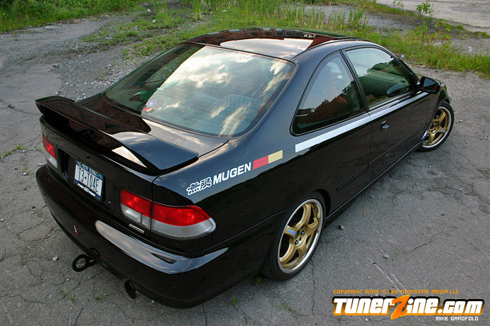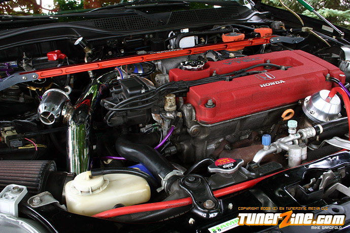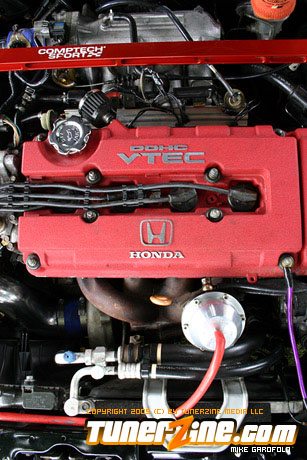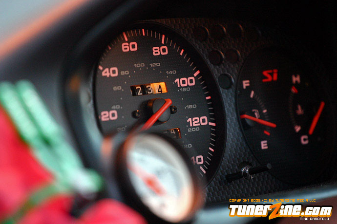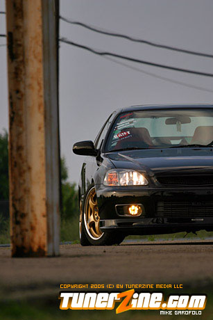 Looking at the car the most obvious part you will drool over are the 17″ Volk Racing Gramlight Pros. Perfectly sitting on some rubber and tucked into the wheel wells using Ground Control coilovers and KYB shocks. As you finally start to notice the rest of the car, you walk around and notice the real Mugen lip tightly fitted on the front bumper, and the OEM CTR headlights staring you down. To the naked eye, you brush off the radiator looking Spearco frontmount intercooler, and peak under the hood to discover a whole turbo set up. Pieced together with a T3/T04e trim turbo with .63 AR and .54 cold side turbo attatched to a Drag manifold down to a 2.5″ Drag downpipe going under the car to a complete 3″ straight pipe and out of a Thermal full stainless exhaust. Looking back inside you also notice the Tial 35mm wastegate, the shiny polished intercooler piping and an HKS blow off valve sitting on top.