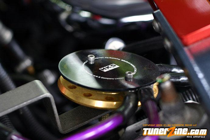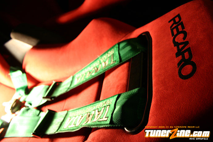 Moving around to the inside of the car, the Red Recaro Speed seats glow in your eyes. With the drivers side equipped with a Takata MPH340R harness. Around the interior are the various gauges like the APexi AVCR boost controller, Apexi turbo timer, Autometer boost guage and a/F guage. Going back to the trunk you find a beautiful Mugen rear strut bar keeping the back end stiff.