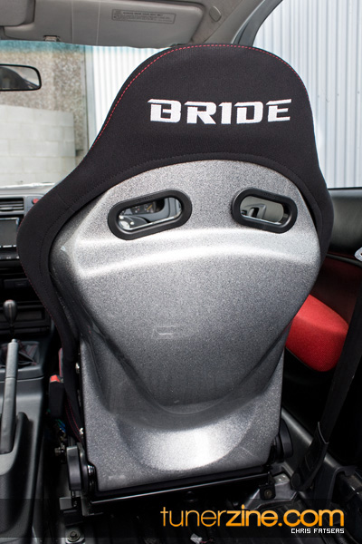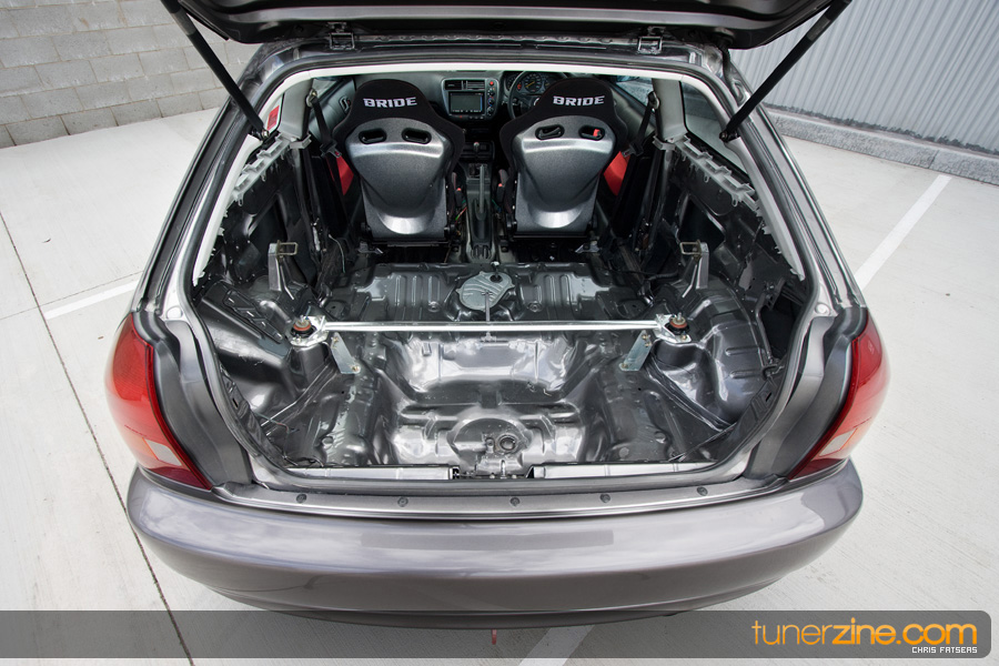 The interior has also been given some upgrades and personal touches of its own. A pair of Bride Stradia Low Max seats are the main feature up front and, trust me, they are as comfortable and supportive as they look. Some more subtle additions to the interior include Bride floor mats, a skunk two gear knob and a whole range of OEM EK9 parts including EK9 pedals. You might also notice a few things missing in the rear if you’re able to pull your attention away from all of the goodies up front. The rear seats and body panels have all been removed to save weight; despite the colour of the wheels, Duy has no intention of using the car as a Taxi.