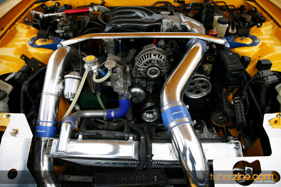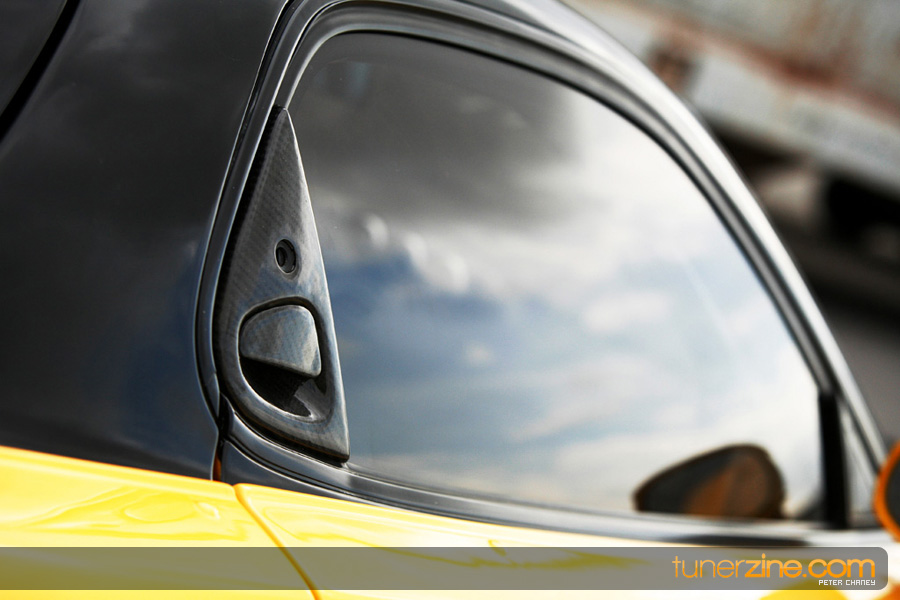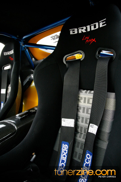 On the exterior there’s no mistaking that this RX-7 has received a full treatment from Veilside. The infamous Fortune widebody kit has completely mutated this RX-7 from subtle daily driver to monster show car. The hood, headlights, front bumper, rear bumper, mirrors, wing and carbon fiber front lip all come from Veilside’s Fortune line. The entire car was then resprayed with BASF’s Pearl Yellow paint with a two tone black mixed in. A series of Carbon Innovation carbon fiber goods were also added on the inside and the outside including door handles, center console, and shifter console. The stock taillights were also swapped out for a more up to date set of JDM ones from ’99. Continuing on the interior, Bride Vios III seats can be seen along with a Cusco 8-point roll cage and Sparco racing harnesses. A series of gauges from Autometer measures everything imaginable for the fortunate driver.