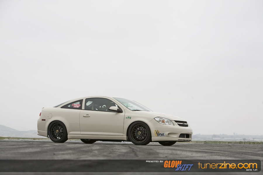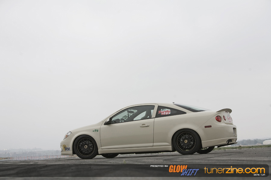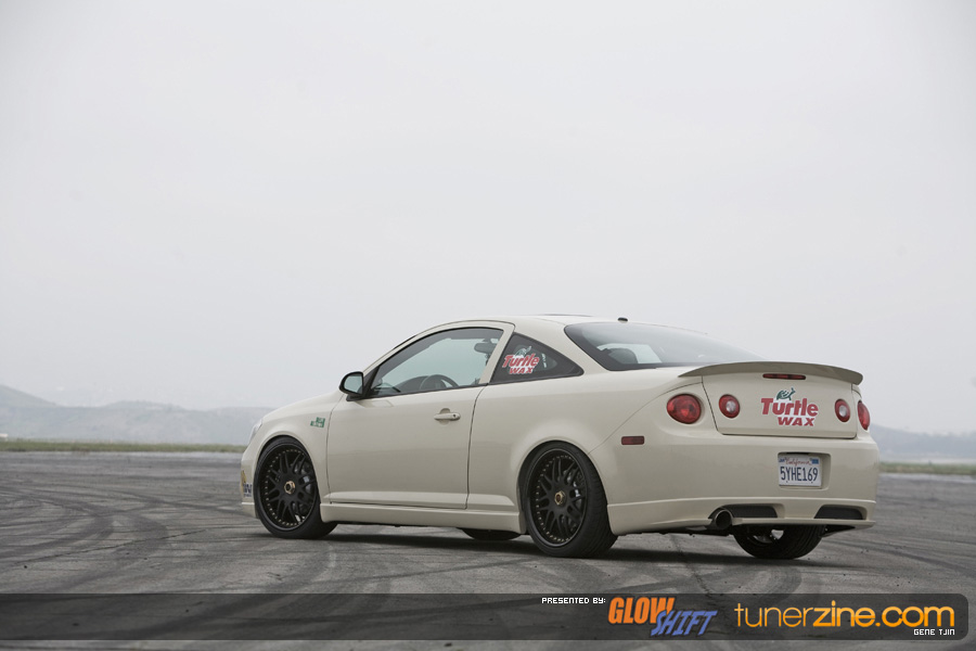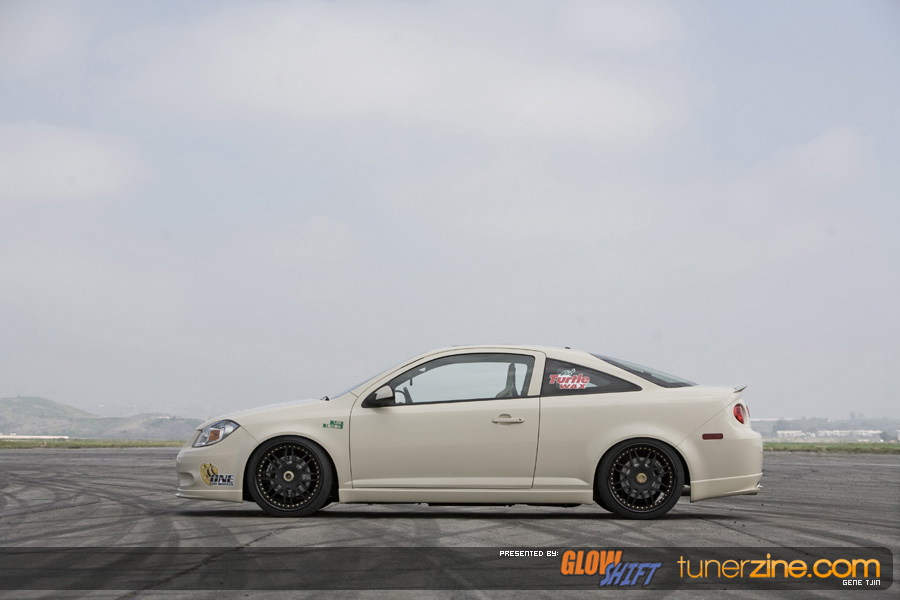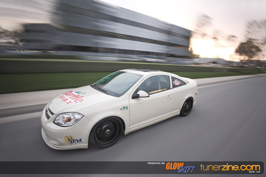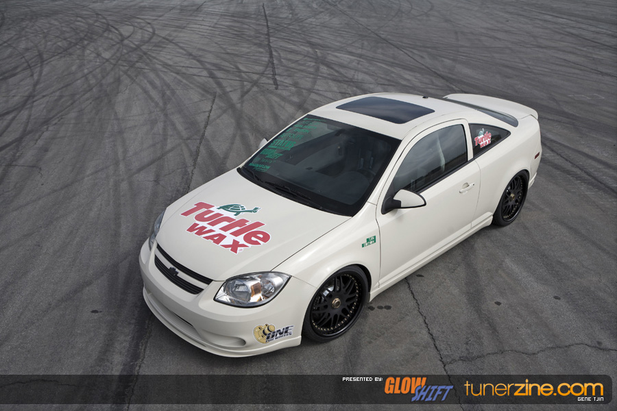 Along with the One Lug Wheels transformation, the Tjin Edition / Turtle Wax Cobalt SS received a fresh repaint with a custom PPG Beige paint job. The GM Performance lip kit and Unique Fabrication all metal rear wing is all it takes to make this Cobalt extremely stylish and eye catching. The emblems have been powdercoated a flat black while Ignited HIDs headlights and fog lights keeps the way well lit.