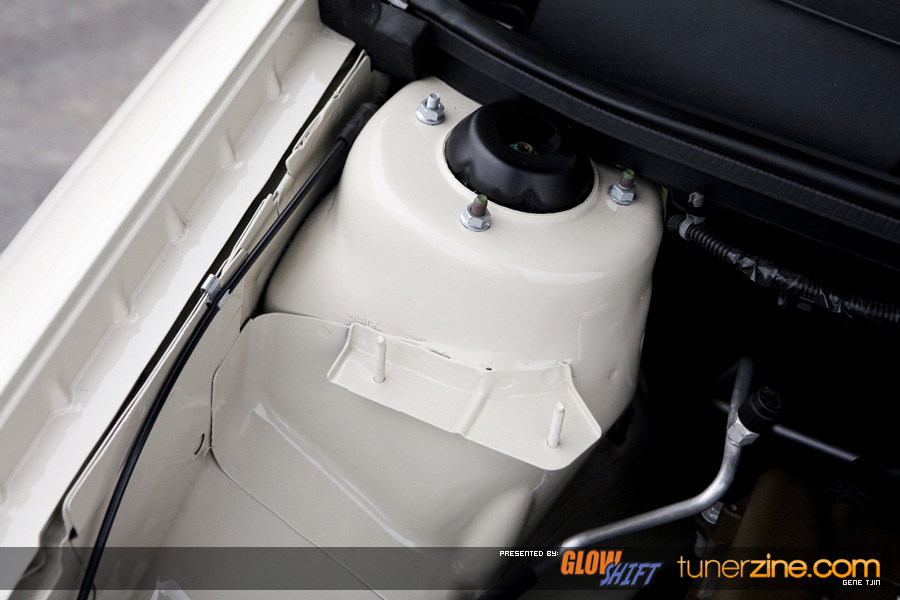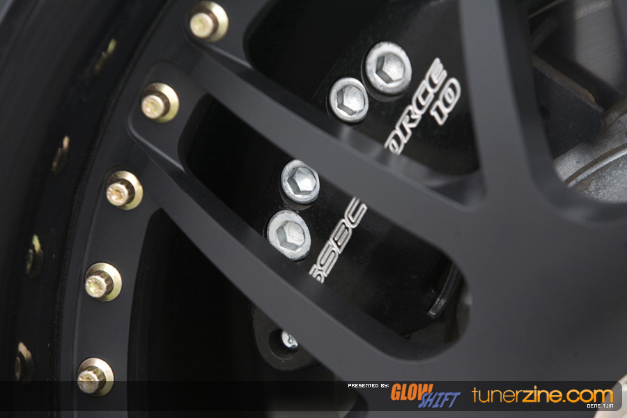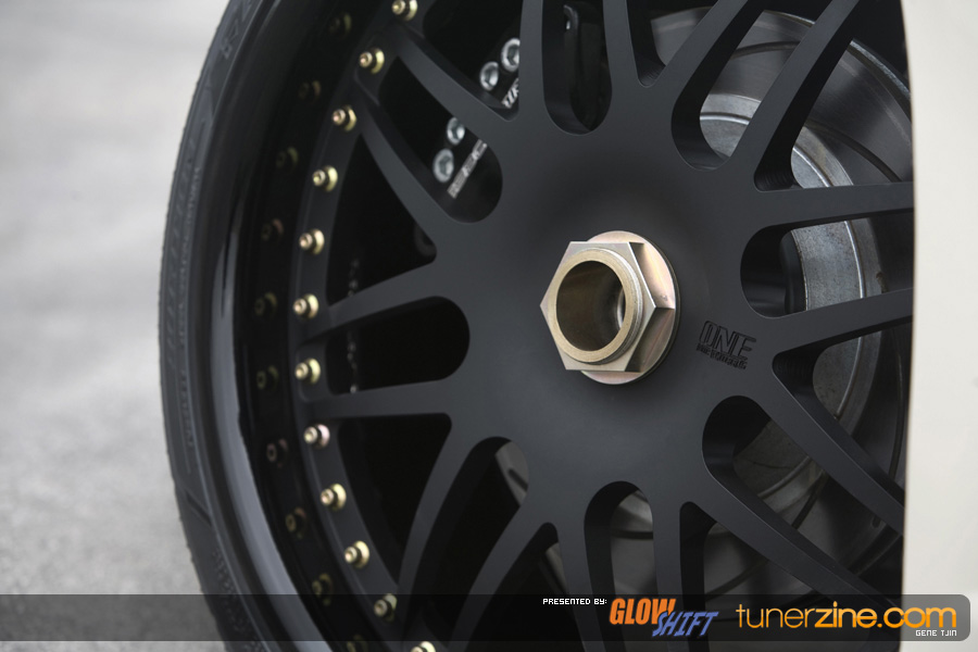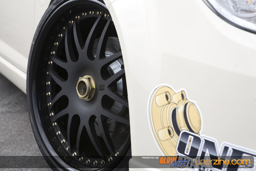 The suspension has been overhauled for 2008 as Tjin Edition / Turtle Wax has teamed up with the folks at Function and Form as well. Their Type II fully adjustable coilovers has been bolted on, giving the Cobalt an all new stance compared to last year as well as improved handling capabilities and adjustability. One of the most noticeable features however are the all new One Lug Wheels. That’s right, your eyes do not deceive you! These wheels will be mass produced and available to the general public soon. Convert those 4 or 5 lug setups to a true race inspired look. The Tjin Edition / Turtle Wax Cobalt SS has been equipped with 19×9/19×9.5 Racing Mesh OLW-5 wheels. The centers have been changed to a matte black finish, accented with gloss black lips and gold bolts. The stylish hub adapter to convert to the one lug is well hidden by the wheel. Only thing that catches your eye is the massive gold center locking nut. We dig it! Wrapped with none other than Falken Tires rubber, these One Lug Wheels are sure to be a huge hit on our market.and remember, you saw it here first, on Tunerzine.com!