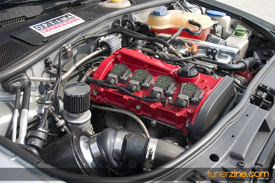 Last but not least, we begged the Audi to pop its hood so we could see the beauties hidden underneath. An APR Stage III+ turbo kit (which offers 310hp / 345ft/lb tq) which features a Garrett GT25 ball bearing turbo sat there staring back at us. An APR Inconel exhaust manifold runs to an APR high flow cat and out through a Scorpion DTM exhaust system. Extra fuel is handled by Porsche 911 turbo injectors while an APR custom front mount intercooler keeps the pressurized boost nice. A GReddy Type-S blow off valve found its way under the hood along with an ITG carbon fiber intake and Canton catch can. A Mocal front mount oil cooler is there for extra safety while an Aquamist water injection system backs it up. The engine cover was powder coated to finish off the looks, along with a polished intake manifold.