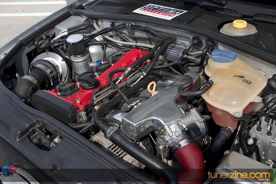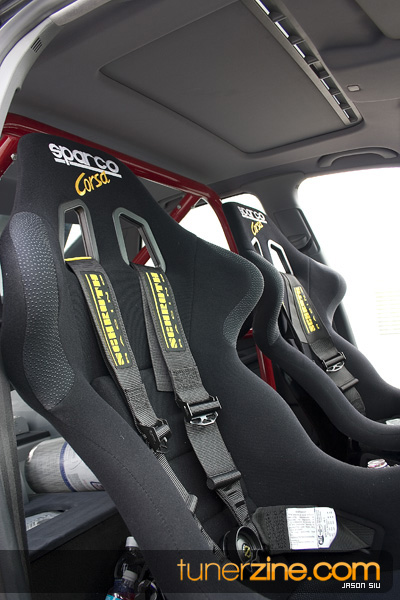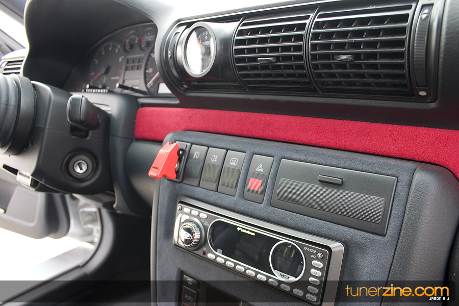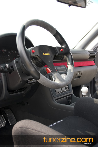 We stopped for a few minutes to catch our breath while staring at the exterior of the car, but we were just dying to jump inside the cockpit to see what awaits us. The Recaro SPG seats with Sabelt 5pt seat harnesses felt comfy and secure while the custom 4pt bolt in roll cage offered something we don’t see everyday. Custom red suede trims jumped out from all sides while a Sparco Flash 5 steering wheel to an OMP hub w/ quick release stared back at us in the driver’s seat. Down bottom we noticed Razo race pedals decorating the floor while a UUC short shifter rounded off with a SPO Motorsport shift knob was ready for our grasps. Electronics galore blinked with an Armtech Sequential shift light ready to go, a Split Second a/f meter for those crucial fuel boosting measures, and a VDO boost gauge custom mounted in the vent monitors the pressurized A4.