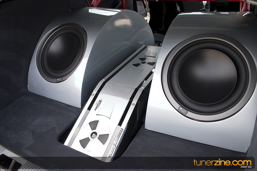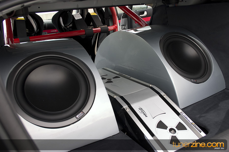 Sitting inside the car, we clicked the ignition on to get some ear-candy. Infinity Kappa 50.5 and 60.5 components adorned the pure sounds powered by an Infinity Kappa 255A 5 channel amp. The bass was far from lacking from the Perfect 10.1 subwoofer, also powered by the 5 channel amp. An Element enclosure keeps the stereo looking sound, along with a Lightning Audio 1.0 cap for extra power.