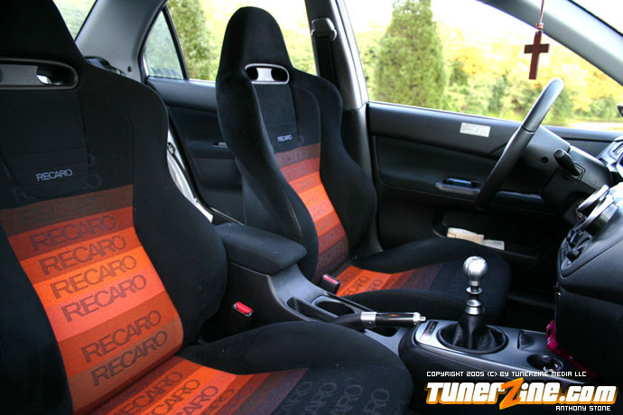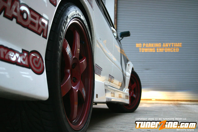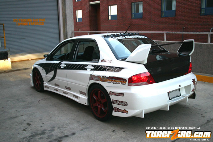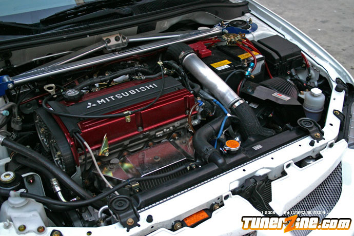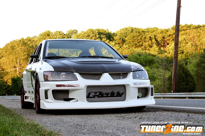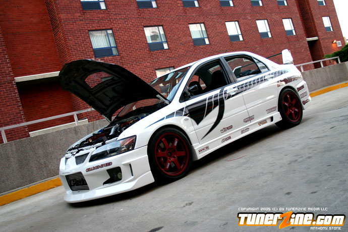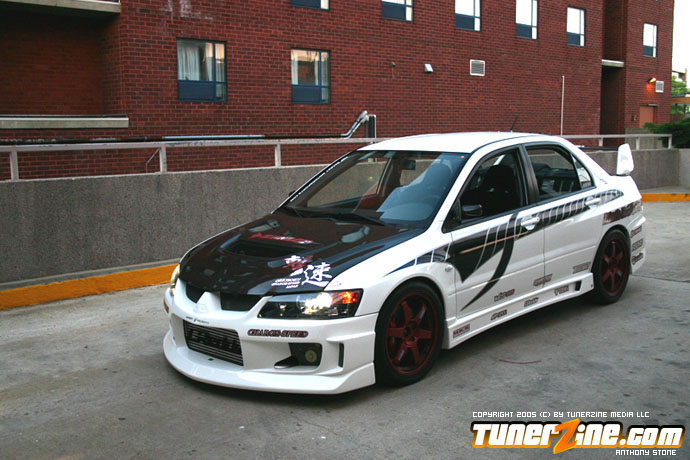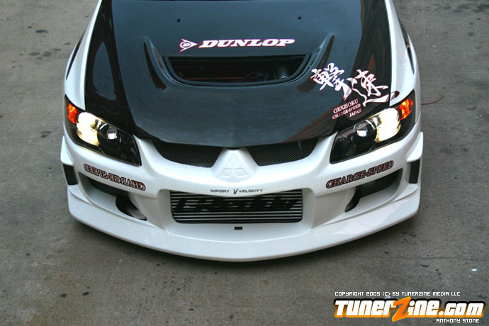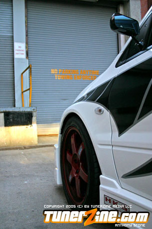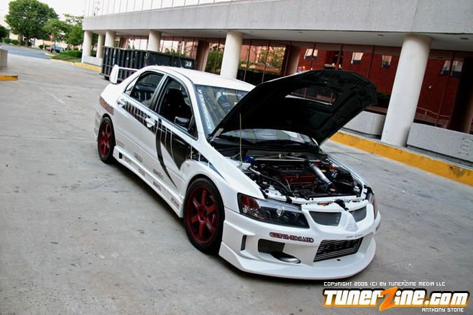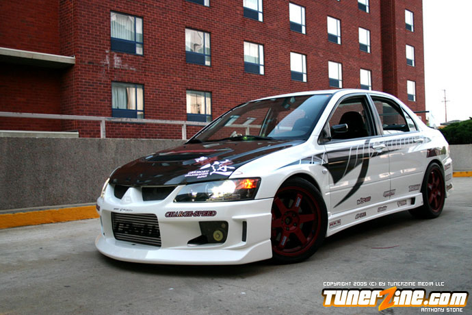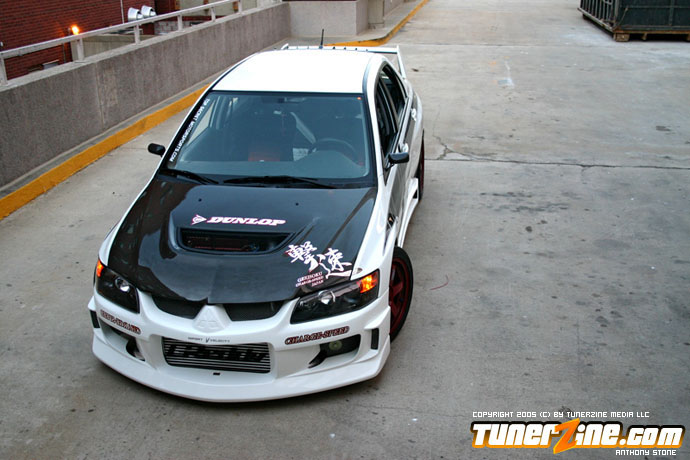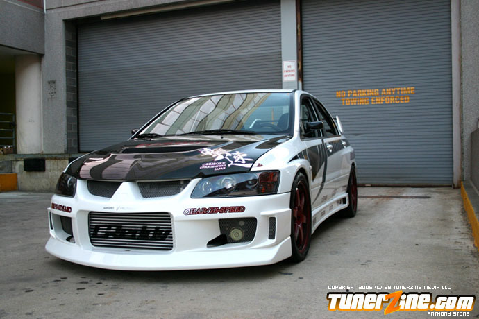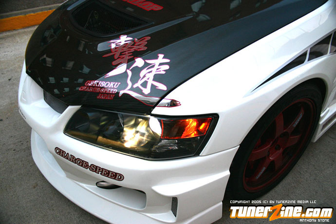 Lowering the exterior of the car to give ample warning that this isn’t a stock Evolution is a set of TEIN S-Tech springs. GTSPEC front and rear strut bars stiffen up the chassis while a Cusco lower arm bar balances everything out for this AWD wonder. Helping give the exterior a whole new aggressive look is a complete Charge Speed body kit and VIS carbon fiber hood and trunk. Mixing black and white often needs a little smoothening out on the edges, so the headlights received a custom blacked-out set and the stock taillights were swapped for the ever popular Evolution 7 set. The wheels are none other than a custom set of TE-37s in a shade never seen before.