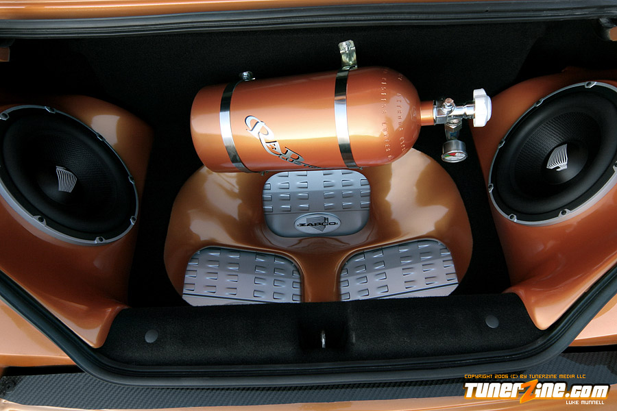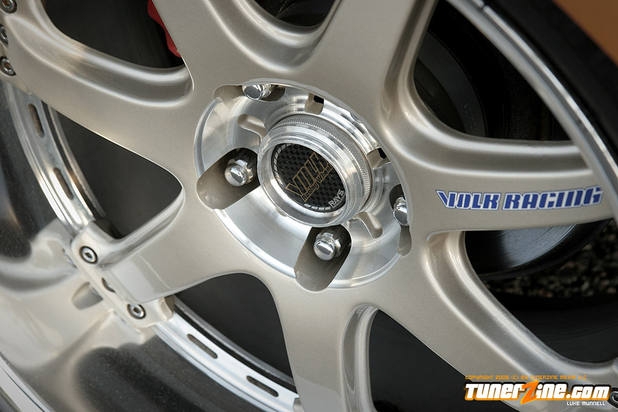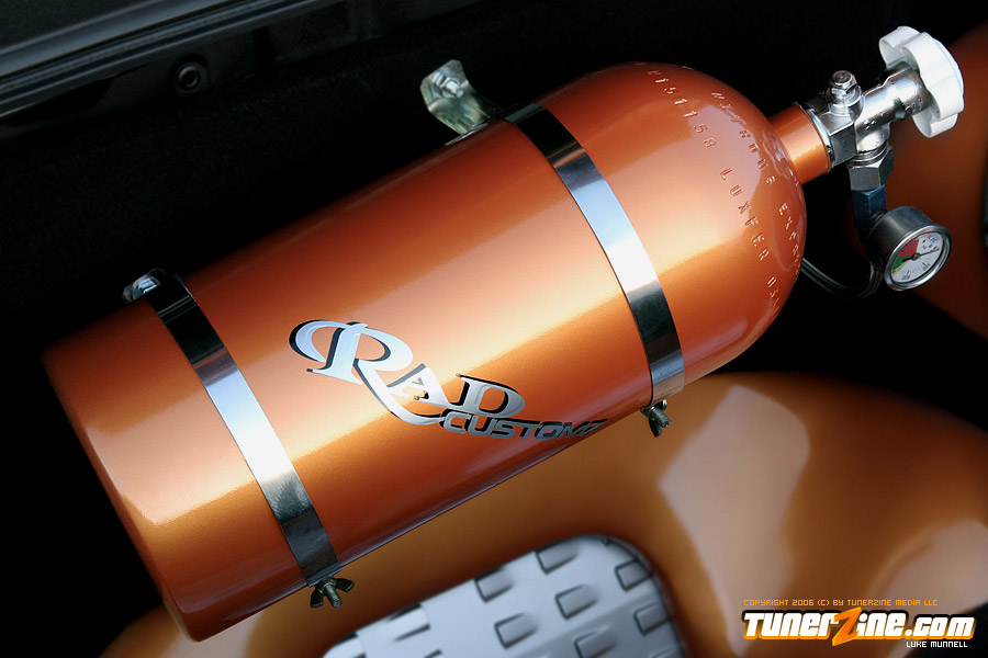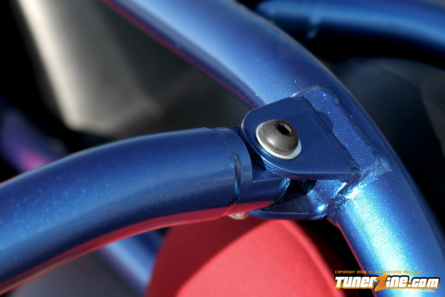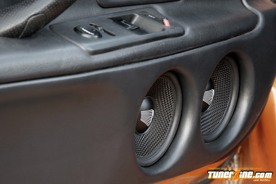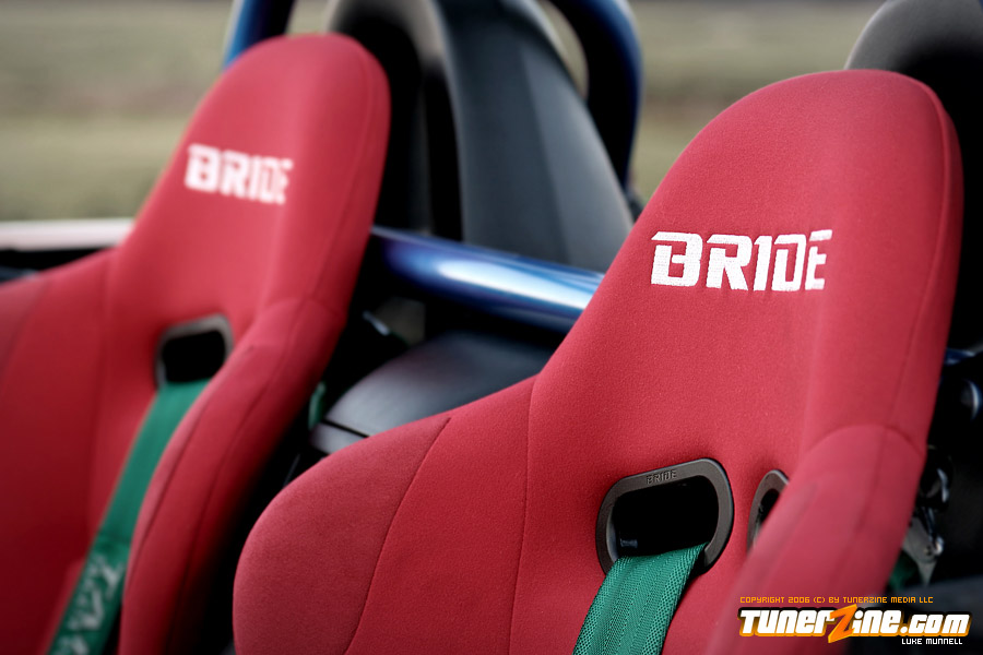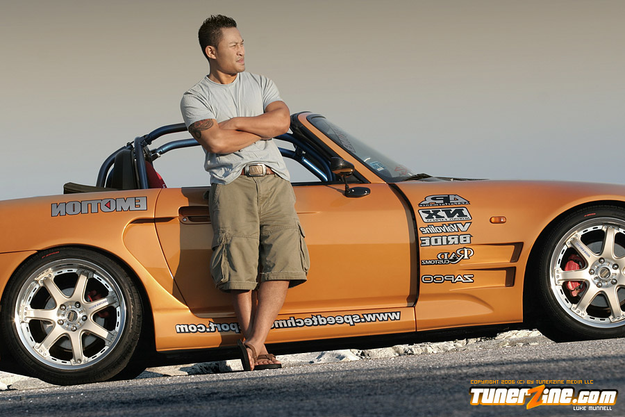 On all four corners, the S2000 reaches an optimal height for show, street and has the performance to drag thanks to TEIN’s RA suspension setup. A staggered set of 18-inch Volk Racing GT-7 wheels in a Noble Gold finish are wrapped with Yokohama Tires to really impress the ladies. When the top gets dropped, a Cusco six-point roll cage just screams while the bright red Bride Zeta III seats accent the Imola Orange pearl exterior. Pivot gauges along with a Sparco Race steering wheel and Spoon Sports titanium shift knob is at Tony’s disposal during daily driving routines. An all out stereo filled with Zapco components is just icing on the cake for this S2000.