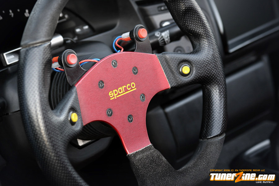 Under the hood, Tony cranks out plenty of power to eclipse the quarter mile in a quick mid 11-second pass. What brings it to those impressive numbers? Well, Tony contacted LoveFab for help on this project. LoveFab, having worked with Stephan Papadakis and his drift S2000, had no problems implementing a fully reliable turbo kit for Tony. Starting with a Garrett GT3071R turbocharger, LoveFab fabricated the exhaust manifold that houses the turbo. A custom v-mount intercooler was setup utilizing a GReddy intercooler and a Koyo radiator was added to insure temperatures wouldn’t reach outstanding numbers. The rest of the engine bay is all business, with ARC tidbits, a titanium front strut brace from Opak Racing and your usual 3-inch exhaust piping and 4-inch intake with K&N filter. Oh yeah, the motor was built too – how could we even forget to mention that?