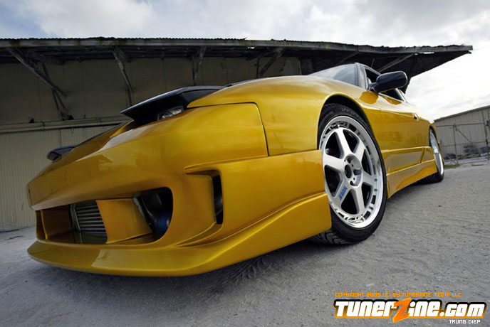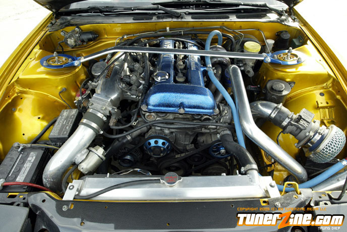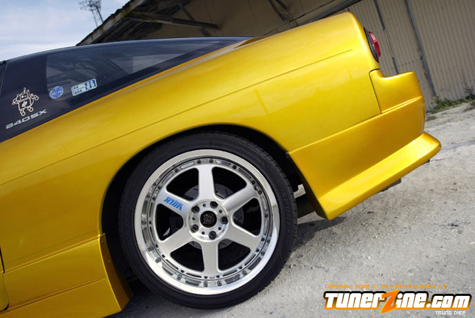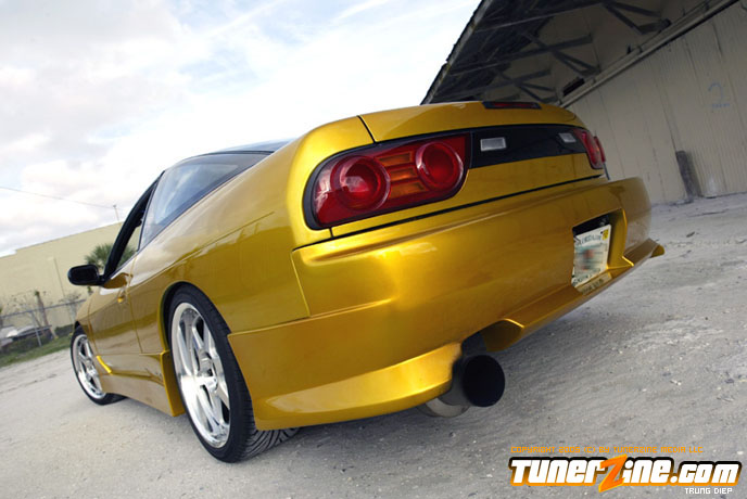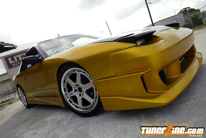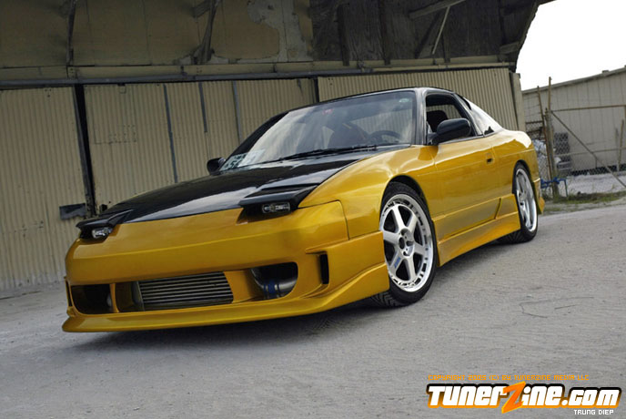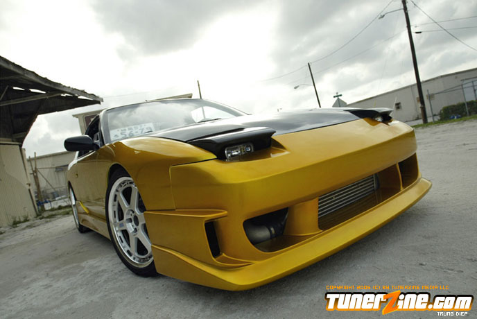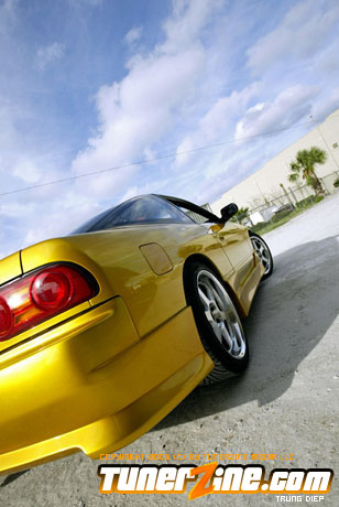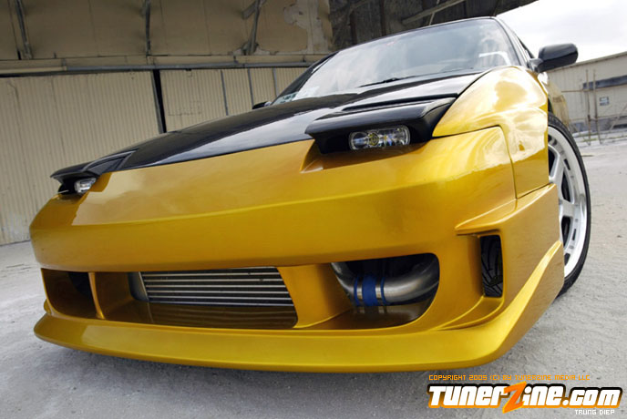 The most noticeable characteristic on his S13 hatch is the bright House of Kolors Pagan Candy Gold that was done inside and out. While the car was getting repainted, Greg grabbed a full Charge Speed 180sx kit for the front, side and rear of the S13. Nothing looks better than keeping with the stock, clean lines of the entire 180sx package except for 180sx Kouki taillights in the rear and 180sx power folding mirrors. To help offset the bright shade of gold paint, Greg bolted on a Charge Speed carbon fiber hood as the finishing touch on the exterior.