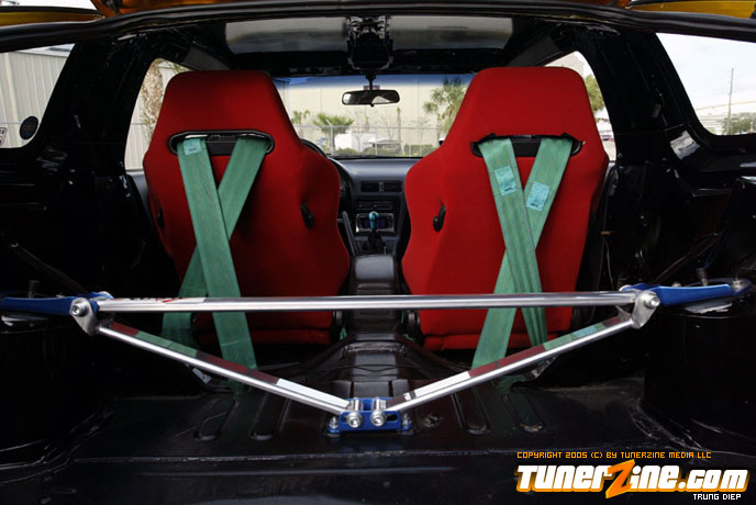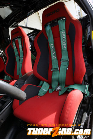 On the interior of this complete package are several electronics from GReddy that are almost trademarked for turbocharged applications: GReddy Profec B boost controller and a GReddy turbo timer. A GReddy boost gauge rests nicely keeping Greg up to date on the psi that’s being force fed through the engine. The stock mundane seats were trashed for a pair of Recaro Speeds. Takata four point harnesses in its green shade almost match the Project Mu pedals and shift knob. Completing the entire 180sx JDM theme is a set of JDM 180sx floor mats, JDM cluster and the JDM flare with matching passenger side panel.