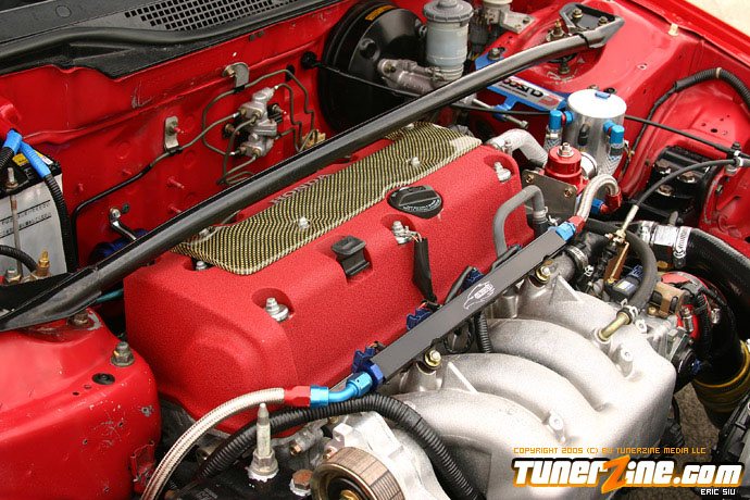 What caught my eye even more were the authentic and rare shoes this girl wears. Dori II in a 15×7.5 size with Trampio 195/50/15 rubber finishes the combo nicely. The stiff stuff includes a set of Skunk2 coilovers mated on Koni Adjustable shocks. The entire chassis is stiffened up with Skunk2 strut tower bars and tie bars.